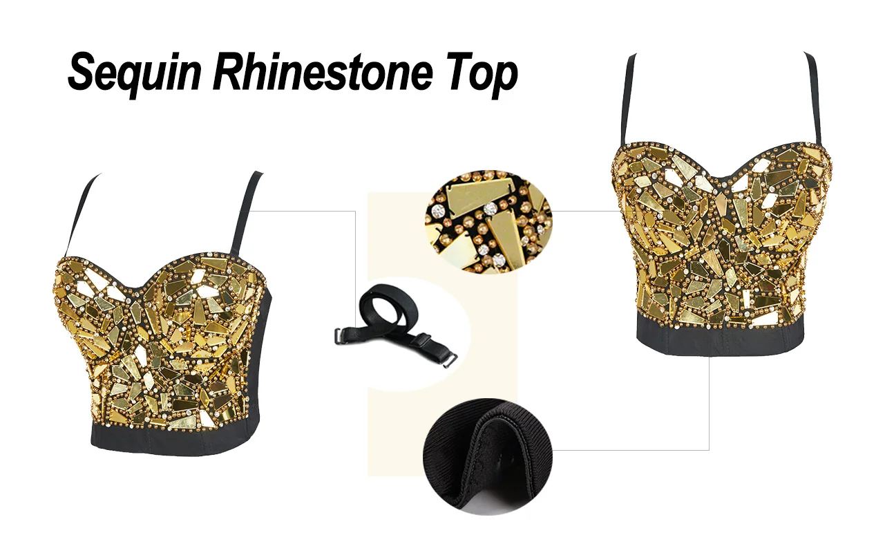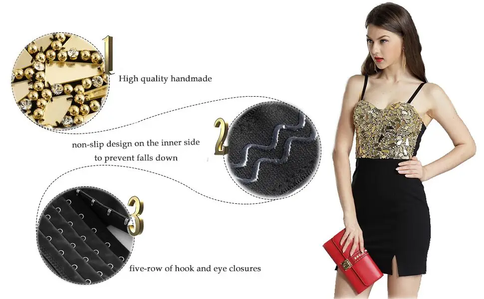 Когда загорается свет независимо от дня или ночи, стразы с блестками будут блестеть и быть яркими. Он светит автоматически с вами, как и ваша красота. Модное платье-бюстье с блестками и стразами, которое выглядит пикантно и шикарно. Укороченный топ-бюстье имеет бюстгальтер на косточках с мягкими чашечками, регулируемые и съемные бретельки. 7 пластиковых костей используются для поддержки тела и отличной конструкции, 4 ряда крючков и глаз закрытия на спине, чтобы отрегулировать размер. Кроме того, вы можете носить его в клуб. Мы считаем, что вы будете наиболее впечатляющими людьми на вечеринке или на вечеринке, на сцене и т. Д.