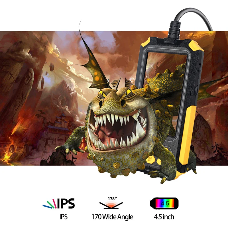 2.【Upgraded 4.5 дюймов IPS Экран 】This Инспекционная камера оснащена 4,5-дюймовый IPS полноцветный Экран, который помогает для съёмок более естественный и четкое изображение от любой угол обзора. Встроенный аккумулятор 2600 мАч поддерживает до 4-5 часов работы.