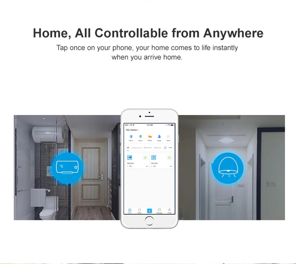 Нажмите один раз на свой телефон, ваш дом приходит к жизни мгновенно, когда вы приедете домой. Заглушка включит светильник крыльца, включит водонагреватель. С S26, все рабочие места готовы для вас