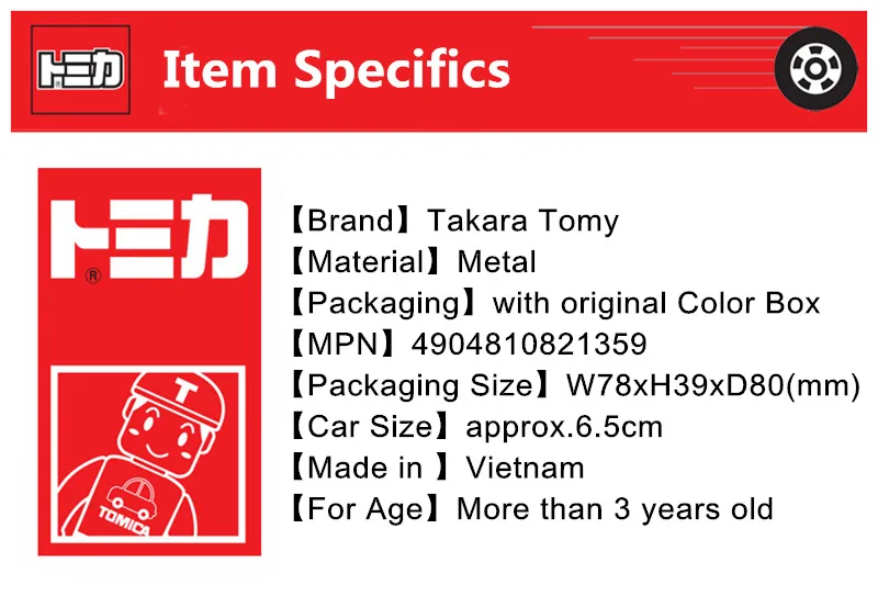 Номер товара. : 4904810821359 Производитель: TAKARATOMY Бренд: Tomica Размер посылка: W78 x H78 x D40 мм Целевой возраст: 3 года ~
