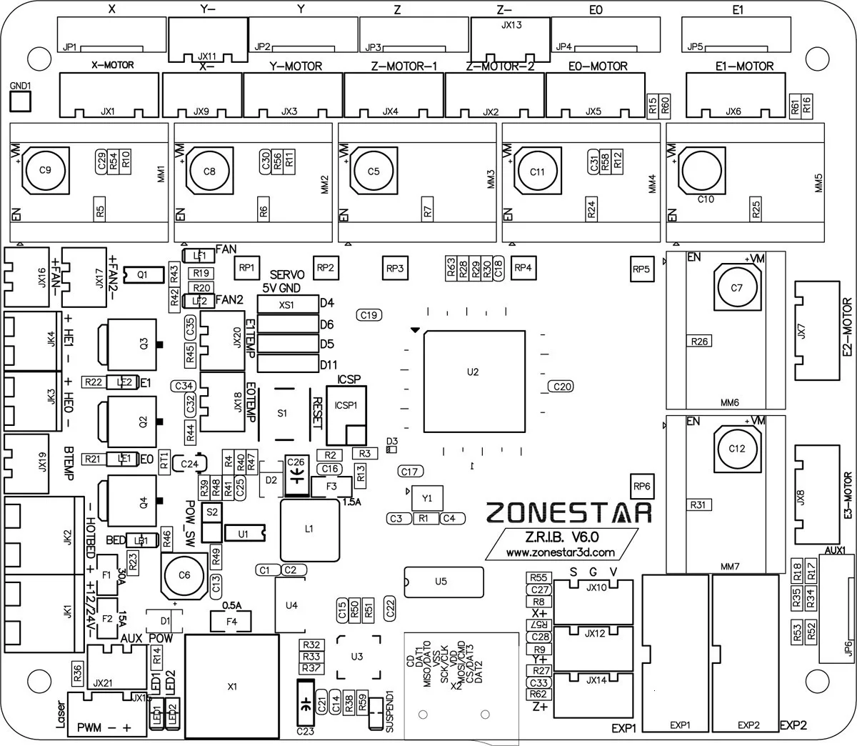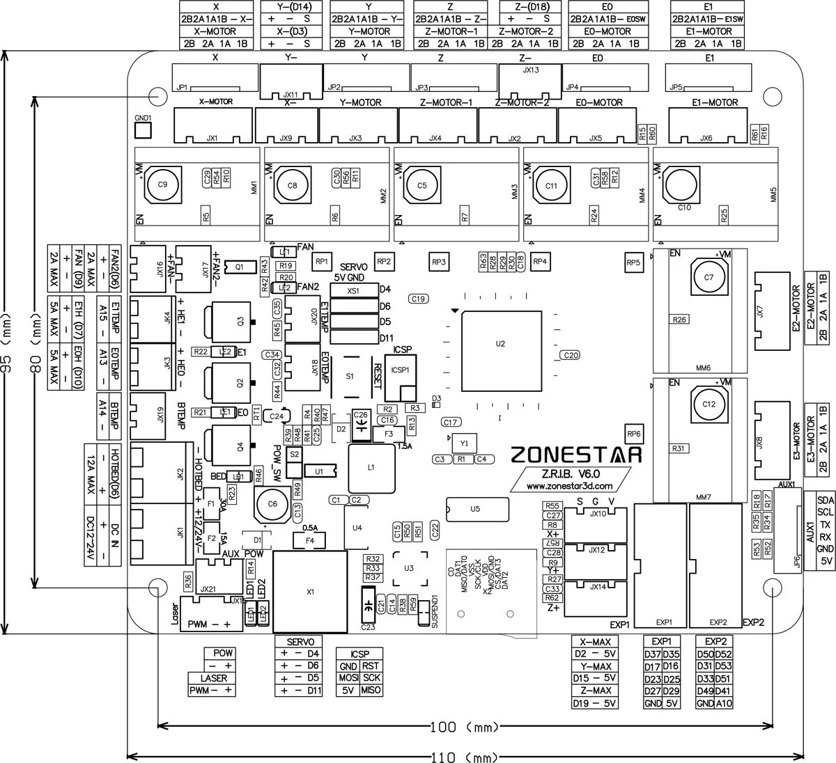Для X, Y, Z, E0, E1, разъем двигателя, iT также обеспечивает пять 6 контактных (PH2.0-6PIN) разъемов, которые сочетают двигатели и ограничительные переключатели, чтобы облегчить проводку.