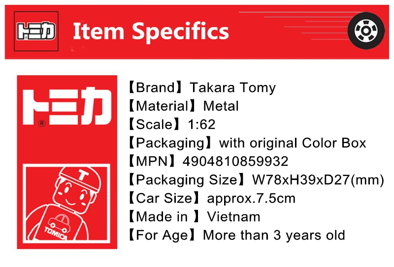 Номер товара. : 4904810859932 Производитель: TAKARATOMY Бренд: Tomica Размер посылка: W78 x H39 x D27 мм Целевой возраст: 3 года ~