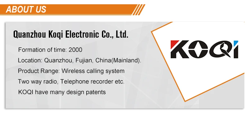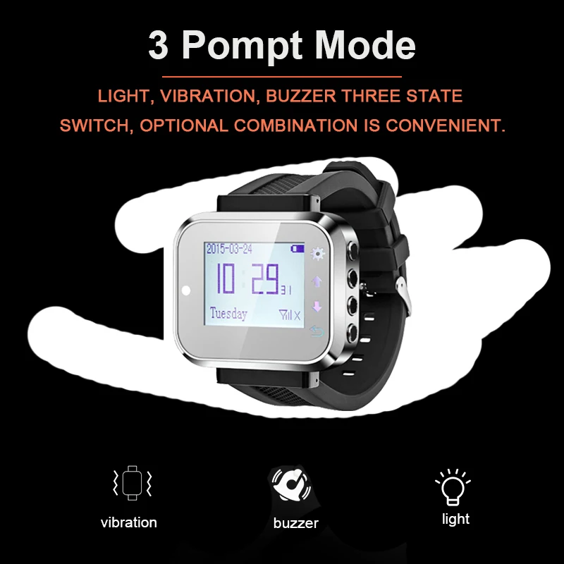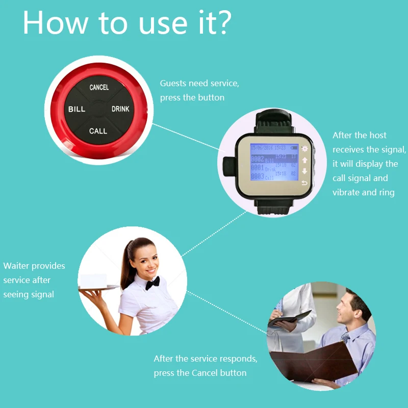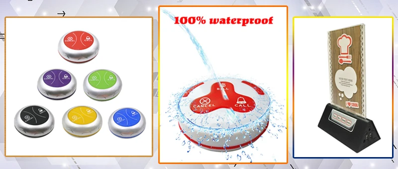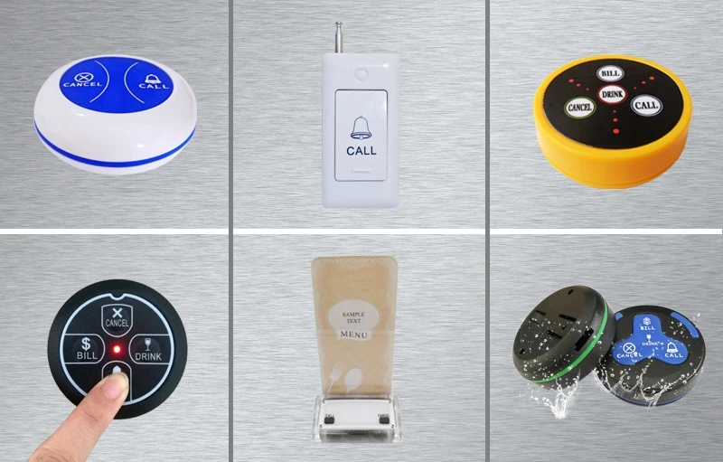 Беспроводная система вызова широко используется в области обслуживания. Он состоит из кнопки стола для использования гостем и приемника сигнала для использования официантом или официанткой. Когда гость нуждается в любом обслуживании, они просто нажимают кнопку на столе, этот номер стола будет отображаться на ресивере с тревожной музыкой или звуком. Поэтому официант может предложить обслуживание очень своевременно.