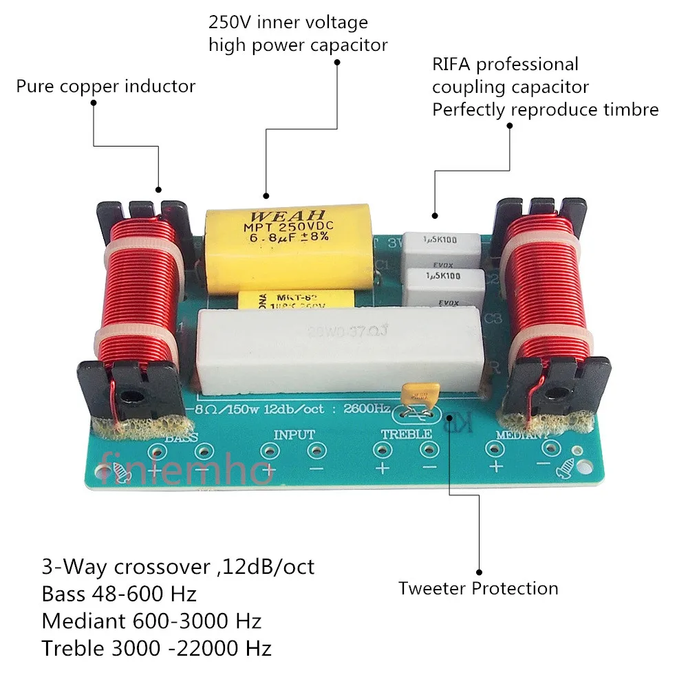 Модель D338 Частота 48-22K Гц Характеристики фильтра 3-сторонний выход кроссовер. Бас 48-600 Гц, Mediant 600-3000 Гц, высокие 3000 -22000 Гц 12 дБ/oct Максимальная мощность обработки 150 Вт Соответствие сопротивления 4 - 8 Ом Рекомендуемый динамик LF 6 дюймов 8 дюймов и 10 дюймов (<= 150 Вт). Средний динамик 3 дюйма. ВЧ 1,5 дюймов 2 дюйма)