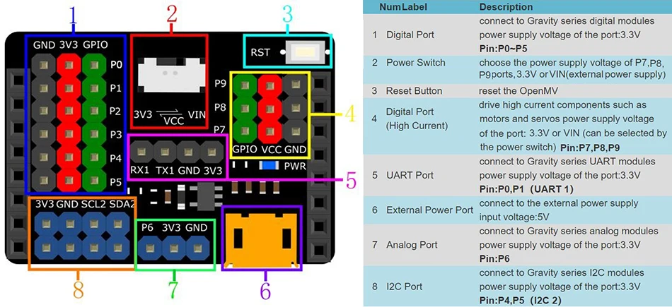 Гравитация: расширительный щит I/O для OpenMV Cam H7 и H7 Plus-это расширительный щит, специально разработанный для OpenMV Cam H7 и OpenMV Cam H7 Plus. Он совместим с различными датчиками и электронными модулями гравитационной серии, подключи и работай, пайки не требуются. Это не только помогает вам избежать сложных проводов, сварки и других операций, но также помогает быстро завершить проводку и начать работу с датчиками или электронными модулями, чтобы быстрее создавать прототипы. Эта плата расширения оснащен 5В USB внешнего источника питания порт и 3,3 V/VIN, выключатель питания, из-за чего расширение щит, а также создавать высокий ток компонентов, таких как двигатели и сервоприводы. Есть 9 наборов цифровых портов, 1 набор аналоговых портов, 1 набор последовательных портов и 2 набора I2C портов на расширительном экране. Дополнительные, имеется встроенный 3,3 V LDO, который соответствует Потребляемая мощность в несколько модулей в одно и то же время. Внимание: Usb-порт расширительного щита используется только для источника питания, поэтому он не может использоваться для программирования или отладки. Постоянный ток порта USB рекомендуется контролировать в пределах 1 А. При установке расширительного щита на материнскую плату OpenMV, пожалуйста, обратите внимание на направление. Usb-порт расширительного щита должен быть на той же стороне, что и usb-порт материнской платы OpenMV. Потому что OpenMV материнская плата работает при температуре не выше 3,3 V, ограниченное по напряжению, она не поддерживает 5V аналоговых входных сигналов. Все сигнальные контакты 0 ~ 3,3 В. Если вам нужно управлять компонентами высокого тока, такими как сервоприводы и двигатели, подключите их к портам P7 ~ P9, затем подключите внешний источник питания и поверните выключатель питания на сторону VIN. В противном случае материнская плата OpenMV может быть повреждена из-за высокого тока. Блок питания порта P7,P8,P9 может быть выбран 3,3 В или VIN переключателем питания. В источника питания напряжение остальные все порты 3,3 V.