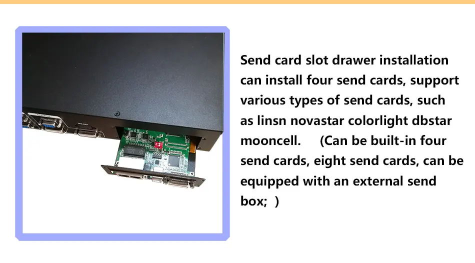 Многооконный процессор имеет три мощных ядра для обработки видео, многографический многовходной смарт-процессор Комбинированный процессор, который может быть широко использован в выполнении художественной деятельности, командный и контрольный центр, Видеоконференции, отели, корты и конференц-залы. Процессор имеет 8 разъемов DVI и поддерживает 8 отправляющих карт. Может достигать 4 × 1, 1 × 4 и 2x2 Гибридный чехол с соединением внакрой, предпочтительнее выбирать один цвет для поддержки 10-мегапиксельный опеределяемый пользователем.