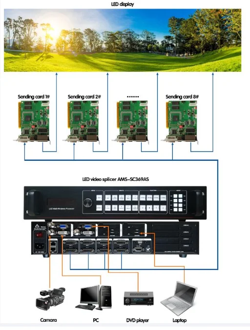 Процессор может вместить широкий спектр входных источников, может получить доступ к 16 видео входам, Включая 4 DVI или HDMI, 4 AV, 4 VGA и 4 * 3G-SDI. Каждый канал может принять стандартное разрешение или Видеосигнал высокого разрешения, DVI, HDMI и VGA могут получать разрешение до 1920 × 1200 @ 60 Гц Вход, для удовлетворения различных выходов высокой четкости. Процессор прост в использовании, с помощью панели клавиш и системы меню для завершения сложных настроек. RS-232 используется для дистанционного управления. Различные входные интерфейсы, для удовлетворения различных потребностей сигнала. Встроенный 4 светодиодный адрес установки карты для удовлетворения требований к установке большой экранной системы