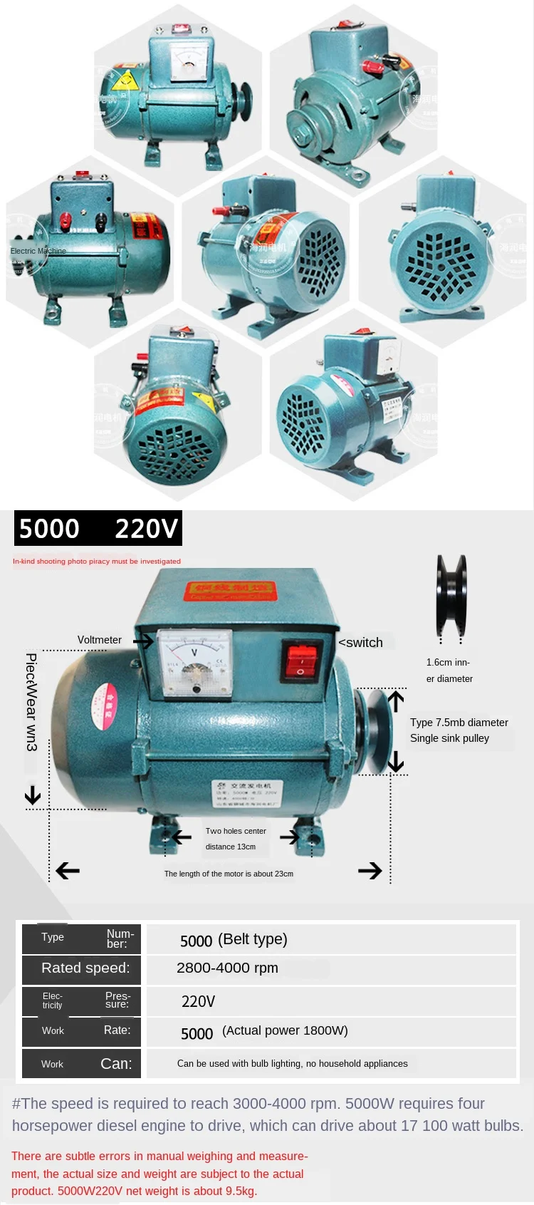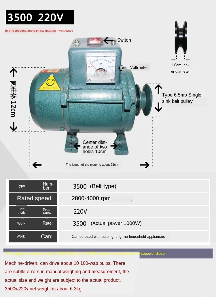 Этот генератор является бесчастотным двигателем, поэтому его можно использовать только для светильник, включающий светильник, такой как светодиодный светильник s, энергосберегающие лампы, вольфрамовые лампы, И не может принести бытовую технику! 3500 Вт требует трех лошадиных сил дизельного двигателя или бензинового двигателя для вождения, и скорость вращения требуется для достижения-оборотов в минуту, который может управлять около десяти 100 ватт ламп. 5000 Вт требует четырехлопастного дизельного двигателя или бензинового двигателя для вождения, и используется для электрической рыбы после тестирования. Пожалуйста, свяжитесь со службой поддержки при покупке, чтобы избежать ненужных проблем!