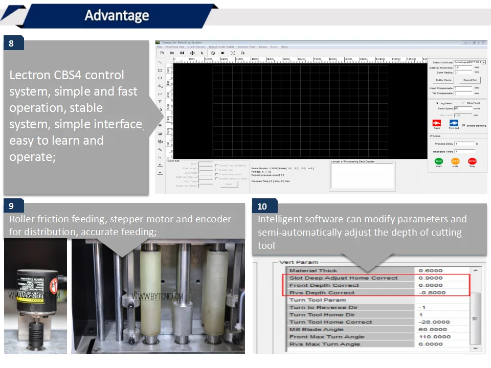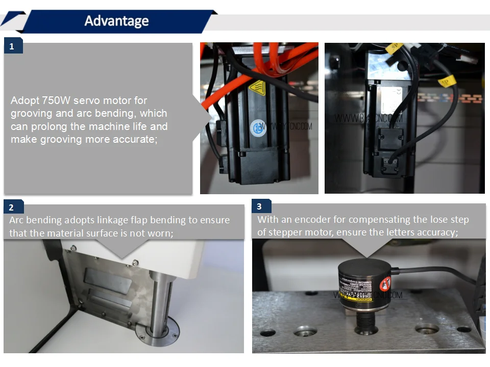 Применение поле: Диапазон применения гибки букв канала обычно в рекламной индустрии. Когда рекламной компании необходимо сделать светящиеся символы для магазинов, он должен использовать канал письма гибочная машина для производства. Эта машина для гибки букв канала может обрабатывать плоский металлический материал, такой как нержавеющая сталь, алюминиевый сплав и оцинкованное железо и не повреждает материал. Высокая точность обработки и быстрая скорость. Регулировка толщины материала и инструмента регулируется программным обеспечением, более удобным и быстрым. Особенности 1. Принять 750 Вт Серводвигатель для канавки и изгиба дуги, который может продлить срок службы машины и сделать канавки более точными; 2. Изгиб дуги принимает загибку рычага для обеспечения того, чтобы поверхность материала не носила; 3. С кодером для компенсации потери шаг шагового двигателя, обеспечить точность букв; 4. Длину, радиан и глубину можно отрегулировать автоматически, установив параметры в программном обеспечении; 5. Лезвие изготовлено из импортной высокоскоростной стали с высокой твердостью и высокой термостойкостью. Это может быть многократным основанием для повышения эффективности и снижения стоимости. 6. Самый маленький диаметр дуги составляет 7 мм, что делает персонажей более точными и изысканными; 7. Многофункциональный, может быть изготовлен из плоского алюминия и нержавеющей стали. Доступный и может удовлетворить большинство потребностей; 8. Lectron CBS4 система управления, простая и быстрая работа, стабильная система, простой интерфейс, легко научиться и работать; 9. Роликовая фрикционная подача, шаговый двигатель и кодировщик для распределения, точной подачи; 10. Интеллектуальное программное обеспечение может изменять параметры и полуавтоматически регулировать глубину режущего инструмента