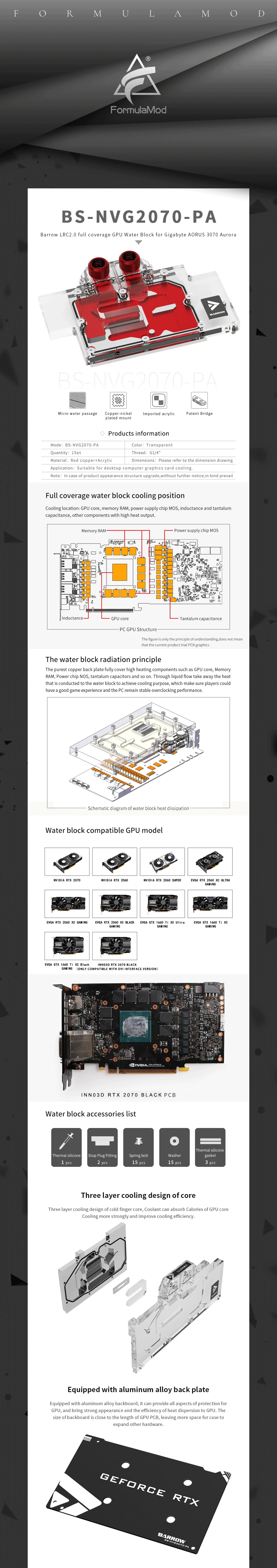 1, пожалуйста, убедитесь, что Ваша видеокарта находится в списке совместимости, в противном случае она может не быть установлена должным образом. 2. Фитинги на рисунке предназначены только для отображения, этот продукт не содержит фитингов. 3. Продукт совместим с оригинальной карточкой заднего плана. 4. Пожалуйста, обратите внимание на положение входа и выхода водяного блока при установке. 5. Если вы не знаете много о вашем GPU, пожалуйста, отправьте ваш PCB GPU продавцу, мы поможем вам найти правильный блок воды.