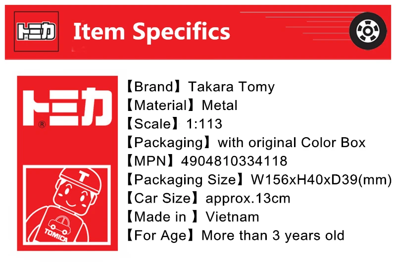 Номер товара. : 4904810334118 Производитель: TAKARATOMY Бренд: Tomica Размер посылка: W156 x H41 x D39 мм Целевой возраст: 3 года ~