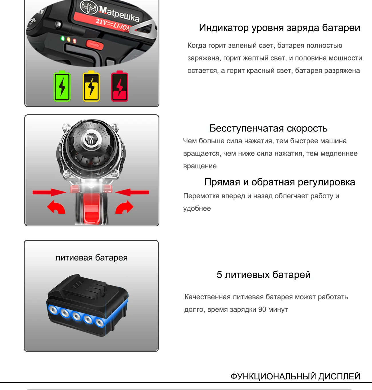 Новинка, 21 в, Высококачественная электрическая отвертка, бытовая Беспроводная электрическая дрель, ручная перезаряжаемая литиевая батарея, электроинструменты Преимущества Введение: Объем работ: сверление стен, сверление металла, Сверление дерева, сверление пластика, скручивание шурупов... 1. Могут быть отменены. Автоматический Патрон дизайн. 2. Плавная. 3. 19 Регулировка крутящего момента. 4. Водонепроницаемый, капля, сила утечки. 5. ECP: устройство защиты батареи для предотвращения перегрузки батареи, перегрева и глубокого разряда. 6. Встроенный светодиодный свет для освещения рабочей зоны также может быть ночной работой. 7. Скрученная мягкая ручка оператора CST обеспечивает отличное сцепление и ощущение комфорта. 8. Быстрая медленная регулировка. 9. Примечание: Все подарки будут отправлены случайным образом. Будут некоторые различия. Пожалуйста, знайте это. 10. Примечание: аккумулятор внутри имеет маркировку 3,7 в * 5 = 18,5 в; При заполнении батареи около 4,2 в * 5 = 21 В. 11. Сверла должны быть оснащены профессиональным сверлом, Пожалуйста, знайте Друзья, пожалуйста, обратите внимание, что продукт содержит батареи специальные методы доставки время доставки дольше, чем средний продукт, Пожалуйста, знайте