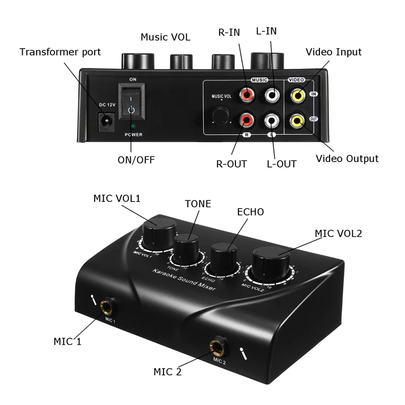 1,2 микрофонных входов, видео вход и выход звука для видеосигнала, объем может быть отрегулировано по отдельности. 2. Для Echo-эффектов и 2 микрофона 3. Маленький, красивый, портативный, хорошего качества 4. Подходит для компании, дома, KTV комнат и т. Д. 5. С AV входом и выходом, можно подключить wth ПК, телевизор или усилитель.