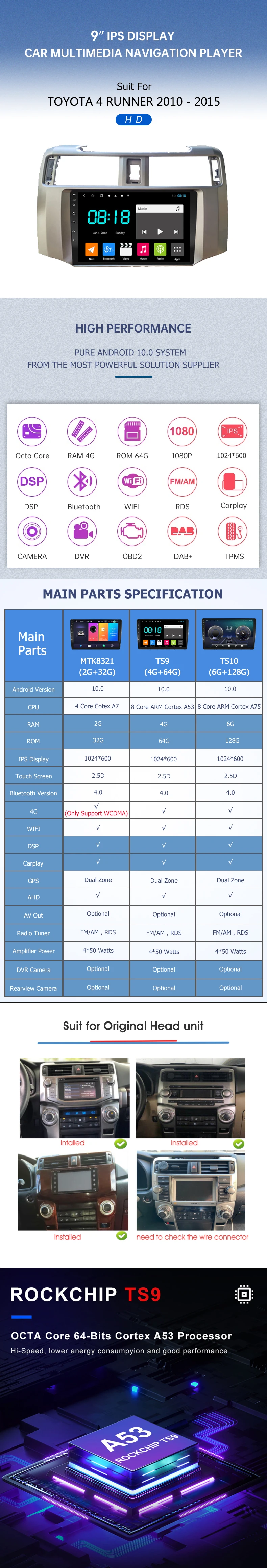 Дополнительное решение: A. MTK8321 ( RAM 2G + ROM 32G) Автомобильный мультимедийный плеер Android 10,0 с четырехъядерным процессором, ОЗУ 2 ГБ + ПЗУ 32 ГБ, GPS-навигацией, Bluetooth, Carplay , DSP, IPS-дисплеем, WIFI /4G , FM/AM, RDS, 4X50Watts выход B. TS9 ( RAM 4G + ROM 64G) Автомобильный мультимедийный плеер Android 10,0 с восьмиядерным процессором, ОЗУ 4 Гб + ПЗУ 64 ГБ, GPS-навигацией, Bluetooth, Carplay , DSP, IPS-дисплеем, WIFI /4G , FM/AM, RDS, 4X50Watts выход C. TS10 ( RAM 6G + ROM 128G) Автомобильный мультимедийный плеер Android 10,0 с восьмиядерным процессором, ОЗУ 6 ГБ + ПЗУ 128 ГБ, GPS-навигацией, Bluetooth, Carplay , DSP, IPS-дисплеем, WIFI /4G , FM/AM, RDS, 4X50Watts выход