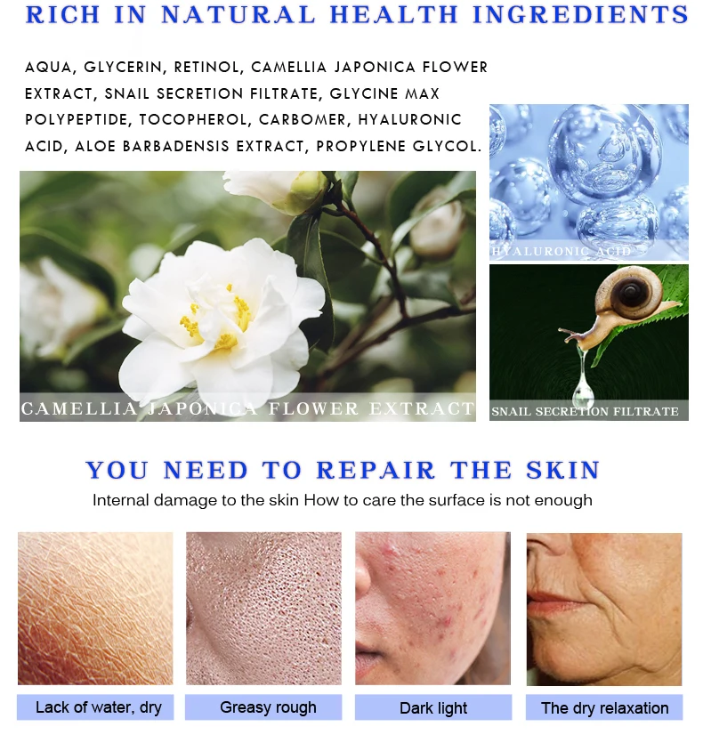 Аква, глицерин, ретинол, экстракт цветка камелии японской, фильтрат секреции улитки, полипептид глицина Макса (СОИ), токоферол, карбомер, гиалуроновая кислота, экстракт алоэ барбинза, пропиленгликоль.