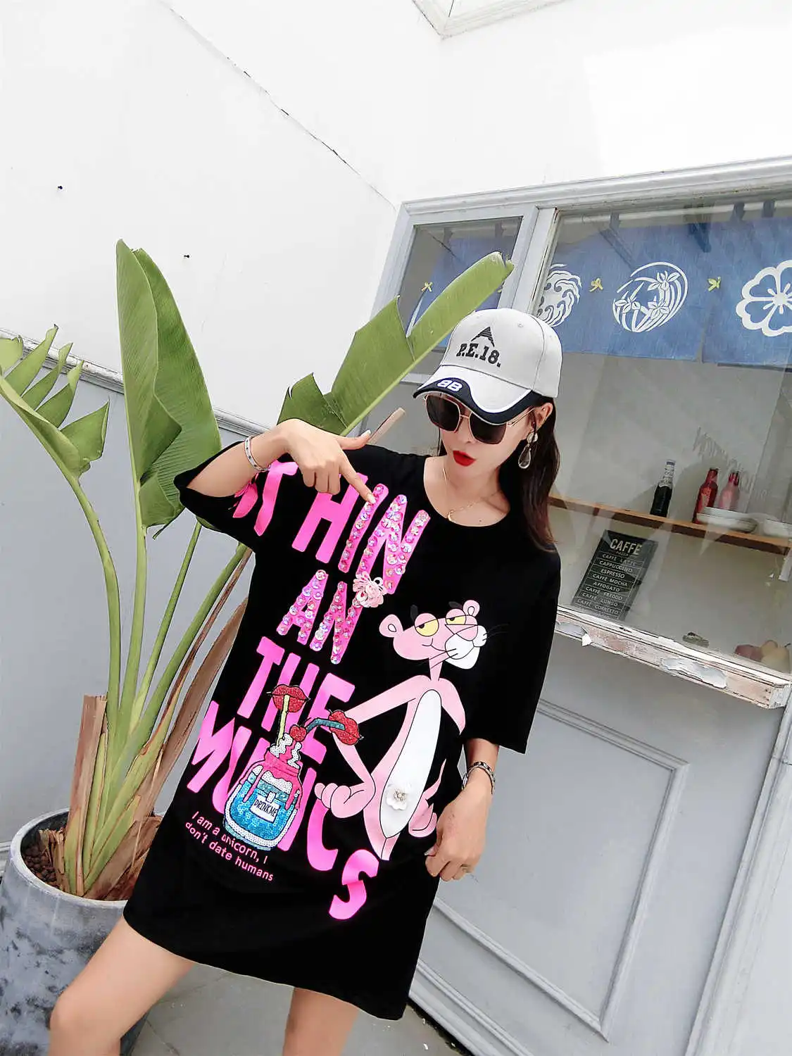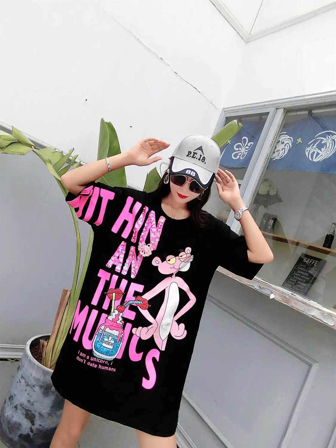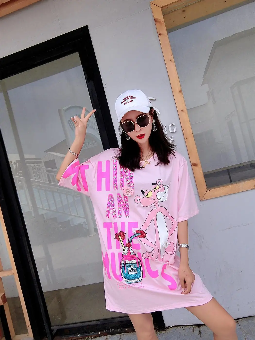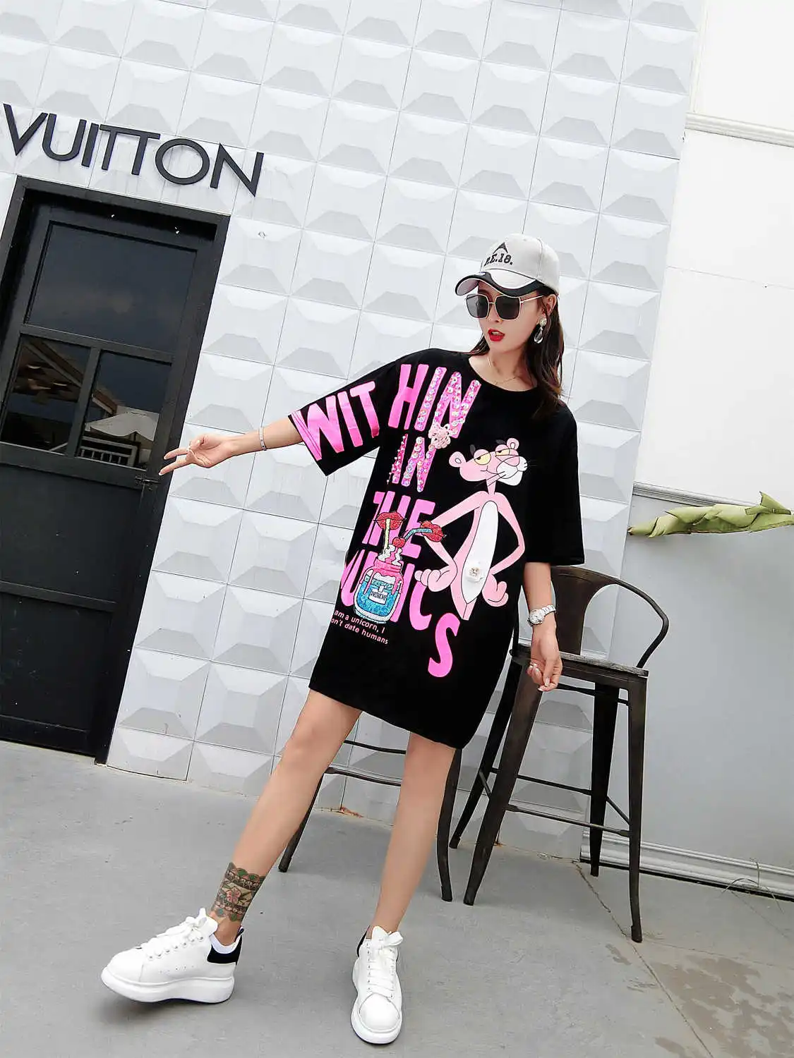 Vefadisa/розовое платье с буквенным принтом для женщин; Платье с принтом героев мультфильмов; мини-платье с короткими рукавами; летняя футболка с блестками и губами; свободные длинные топы; ZLD840
