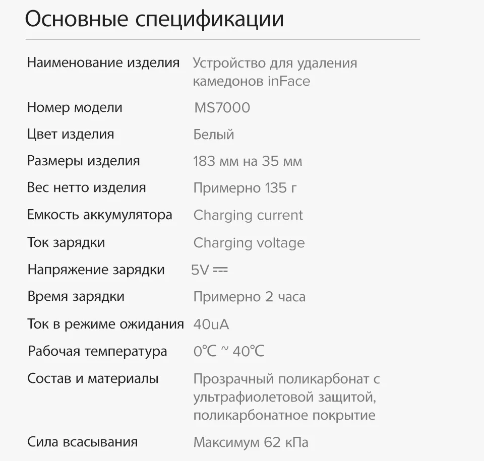 Название продукта: InFace Blackhead Instrument Цвет изделия: белый Размер изделия: 183 мм x 35 мм Вес нетто: около 135 г Емкость аккумулятора: 400 мАч Ток зарядки: 300 мА Напряжение зарядки: 5 В Время зарядки: около 2 часов Ток в режиме ожидания: 40UA Рабочая температура: 0 ℃-40 ℃ Состав материала: прозрачный Поликарбонат струйный тупой УФ, поликарбонат электропластина Инструментальное всасывание: максимум 62 кПа Посылка включает в себя: 1x inFace Blackhead инструмент