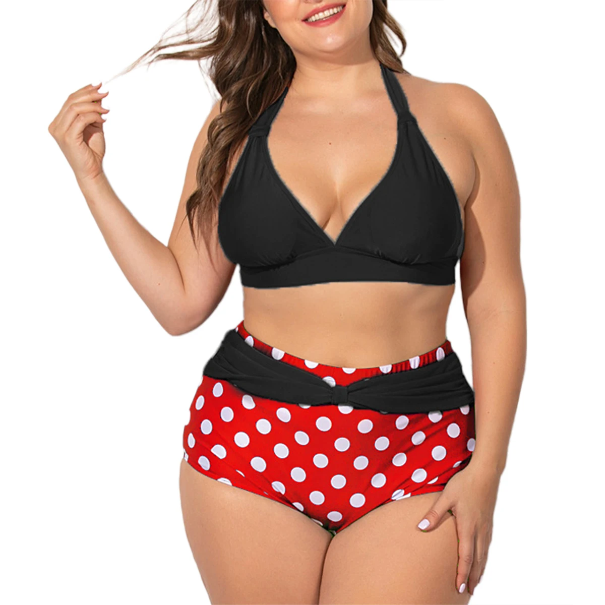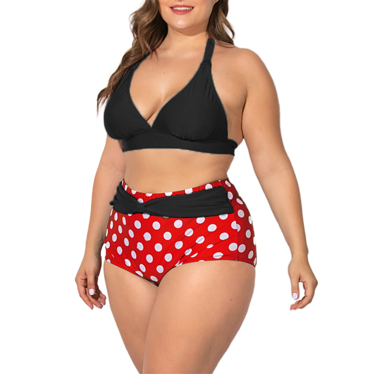 | Женский купальник-бикини в горошек большого размера, Двухсекционный купальный костюм с лямкой на шее двойного цвета