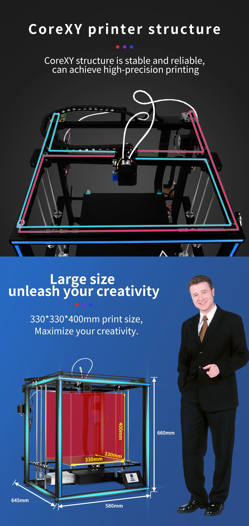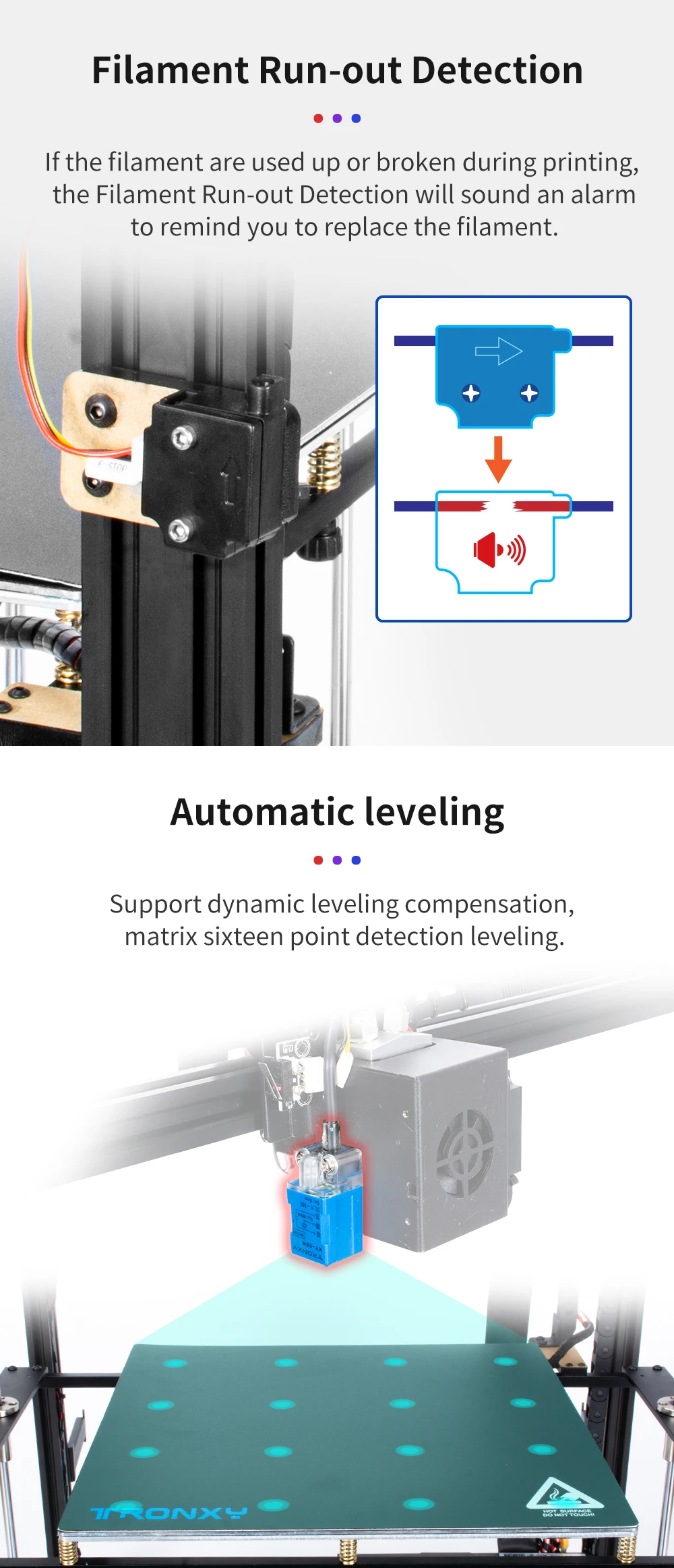 Новейший 3d принтер Tronxy X5SA-2E обновлен до 2020 года 1,24 в 360 Вт мощная стабильная структура 2. Автоматический Датчик выравнивания 3. Ультра-тихий драйвер 4. Восстановление печати после отключения питания 5. Двойное Обнаружение нити 6. Двойные титановые экструдеры 7. Большая плита 8. Двухцветная печать 9. Экран 3,5 дюймов Полноцветный Сенсорный экран Экран