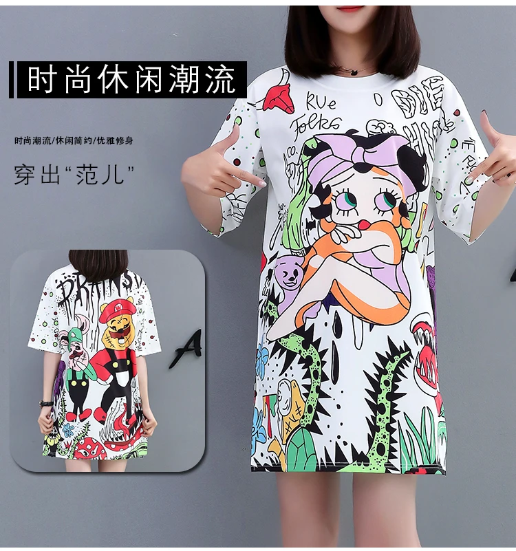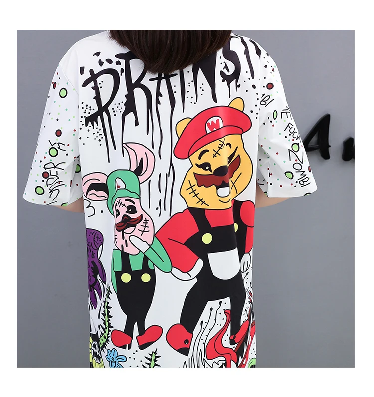 QING MO, платье с мультяшным принтом, Женская длинная футболка, Летнее мини-платье с коротким рукавом, Женская белая футболка, топы, женское Повседневное платье