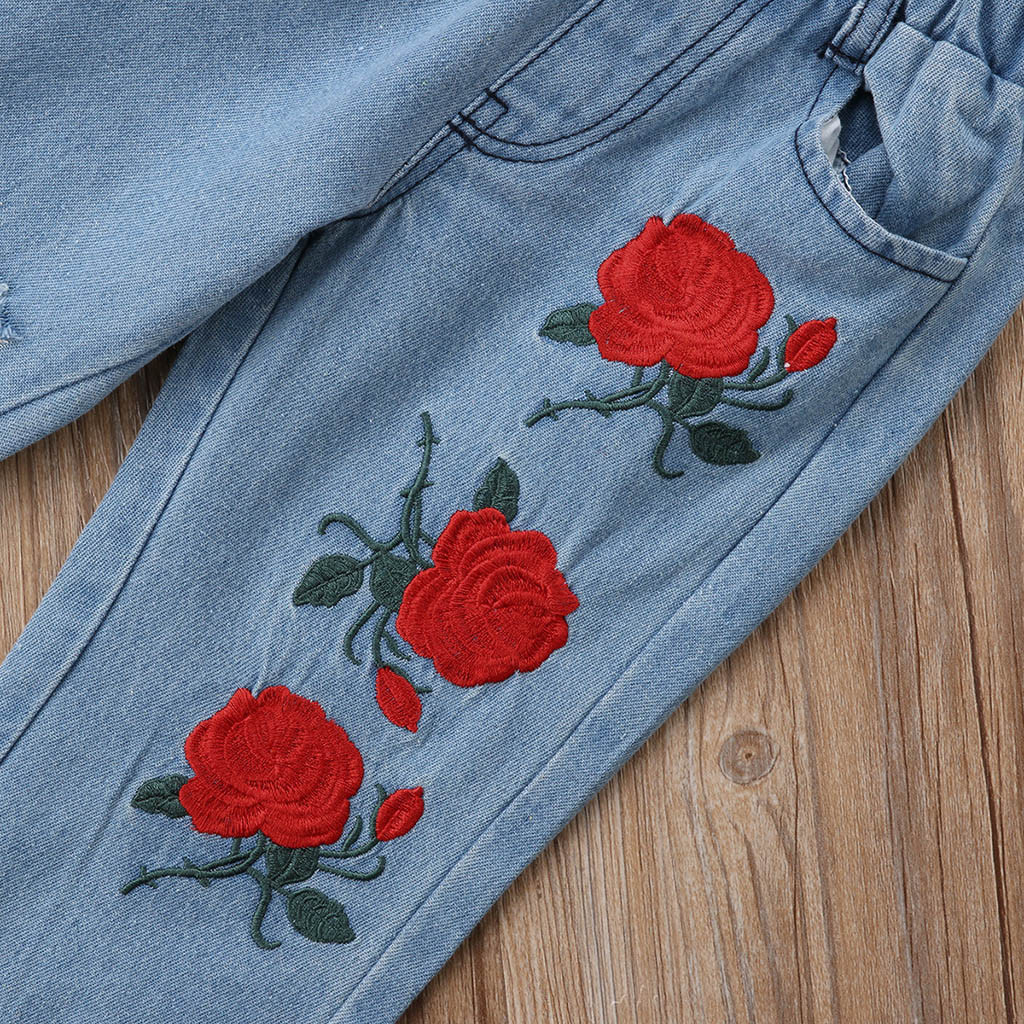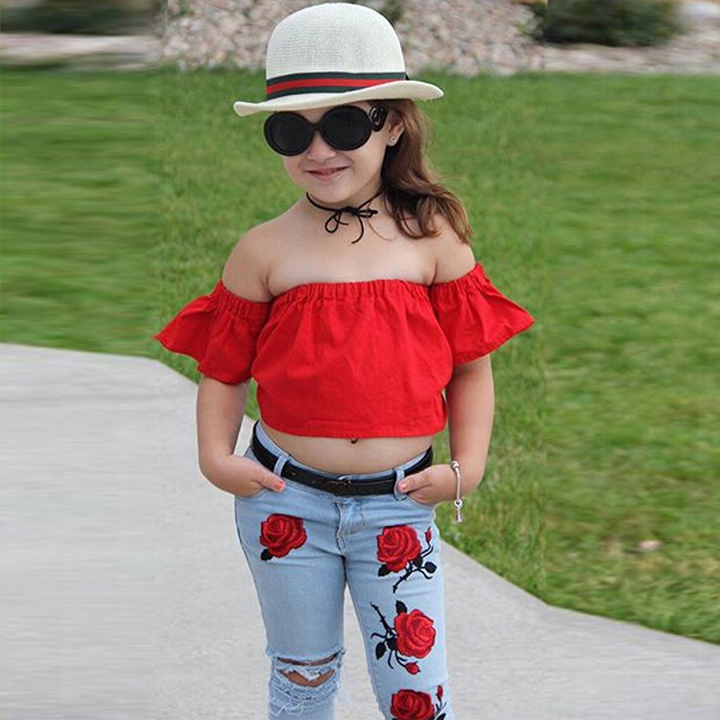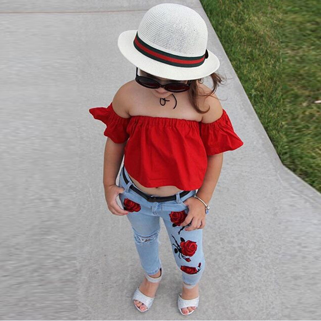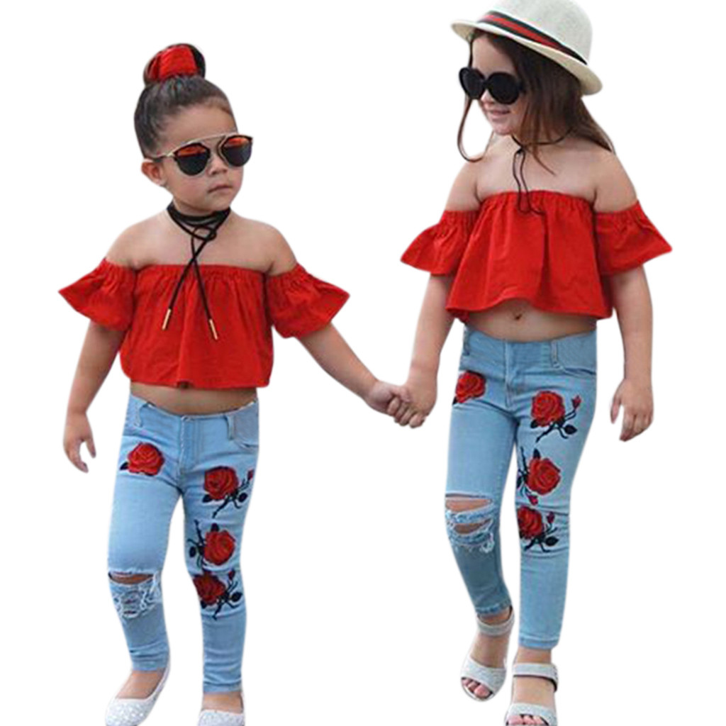 Однотонные топы с открытыми плечами для маленьких девочек + джинсовые штаны с дырками и розами, модная одежда для принцессы, conjuntos infantil de menina, Новинка