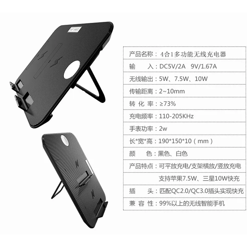 Название: беспроводное зарядное устройство 4 в 1. Расстояние датчика (чехол): 2-10 мм. Вход: DC 5V/2A, DC 9V/1.67A. Выход: 5V1A(5 Вт), 9 В/1.1A(10 Вт). Мощность: 5 Вт/7,5 Вт/10 Вт. Мощность часов: 2 Вт. Д * Ш * В: 202*160*15 (мм). Интерфейс: Micro-USB. Частота: 110K-205K. Эффективность зарядки: ge 73%. Совместимость: подходит для всех устройств с поддержкой Qi. Быстрая зарядка: 7,5 W для iPhone, 10 Вт для Samsung(QC2.0/3,0 адаптер нужен).