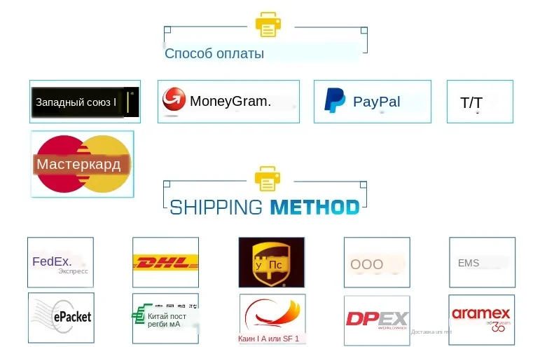 | Способы оплаты: | Paypal, Western Union, банковский перевод, кредитная карта, Alipay, WeChat |
