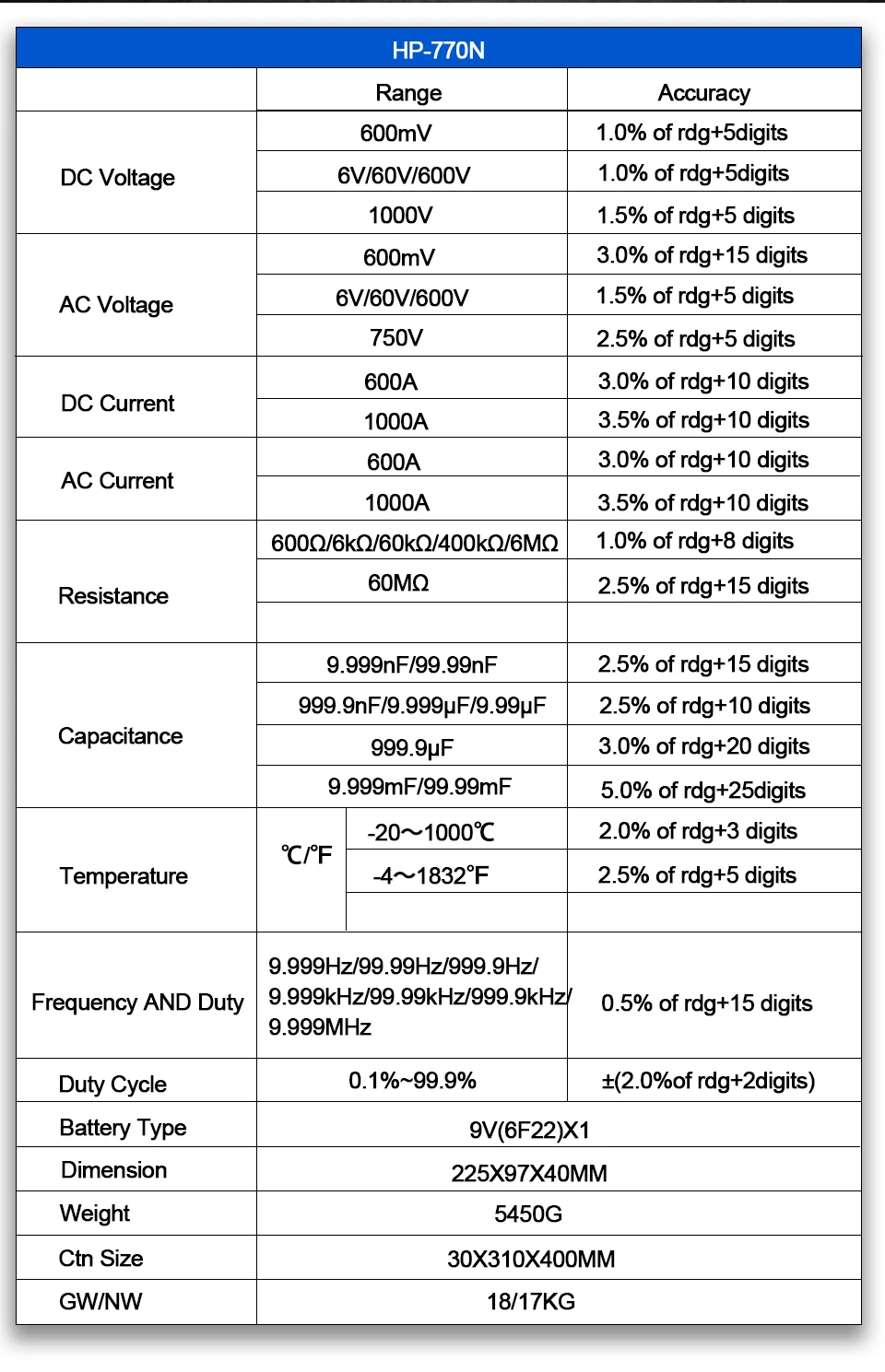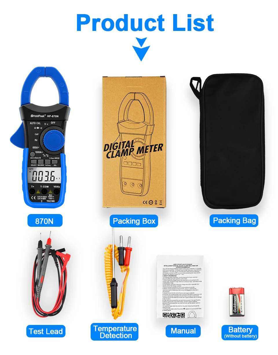 Цифровой мультиметр-зажим HoldPeak HP-870N x1 Руководство по эксплуатации на английском языке-1 шт. Тесты приводит x1 Датчик температуры x 1 Сумка для переноски-1 шт.