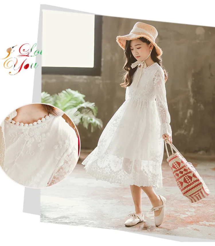 details shown of this big girl maxi long dress for wedding party lace crocheted floral korean clothes children