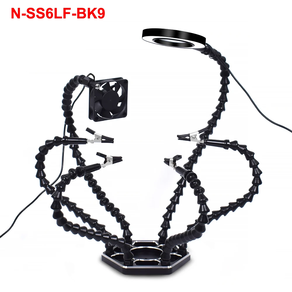 2. Гибкие ручки с 3 большими поворотными зажимами типа крокодил, 1 шт. увеличительное стекло 3X-5X, 1 шт. перезаряжаемый usb-фонарик с увеличением 1X-4X, 1 шт. бесщеточный usb-вентилятор постоянного тока,Зажим/увеличительное стекло/фонарик можно снять.