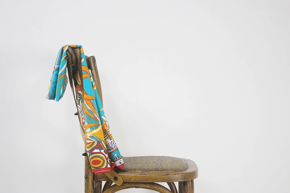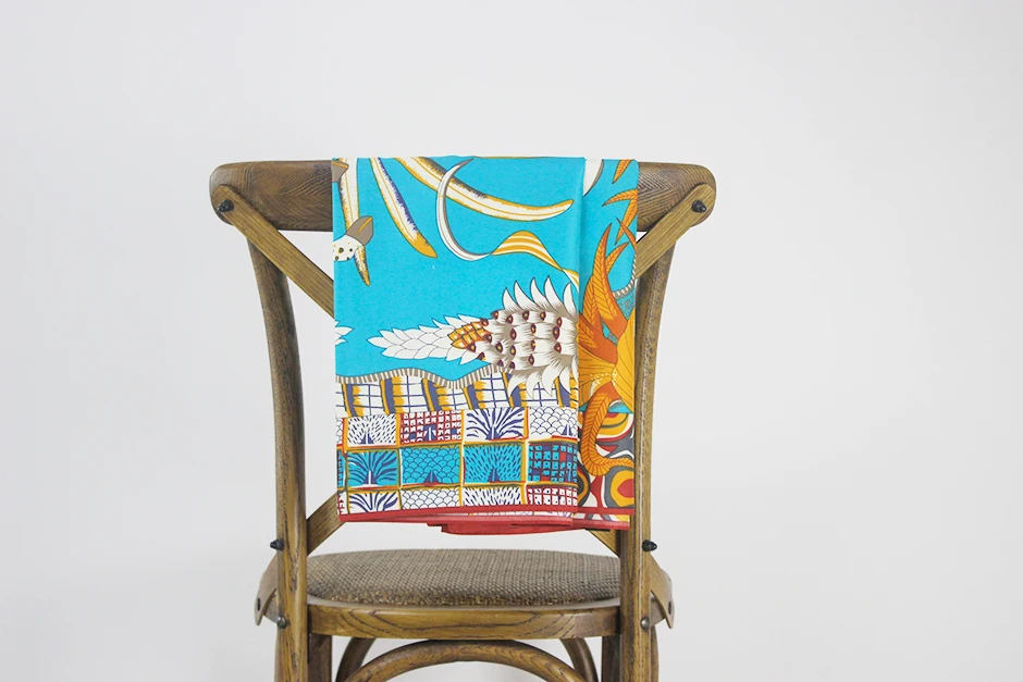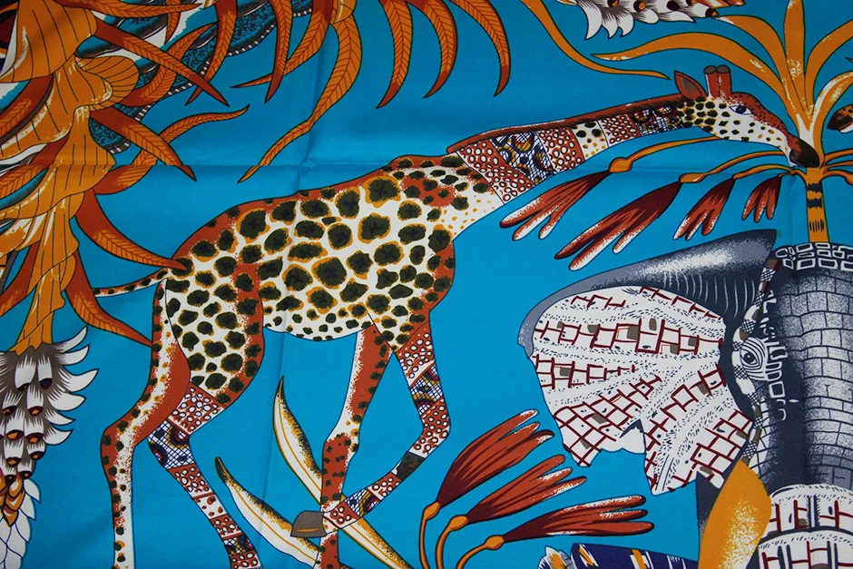 Сильный и величественный слон марширует в центре шелкового шарфа, символизируя семью и силу. Он окружен земными животными, которые растут вдоль реки Замбези. Края украшены растениями, узорами кожи питона и узорами кожи крокодила, уникальными для Африки.