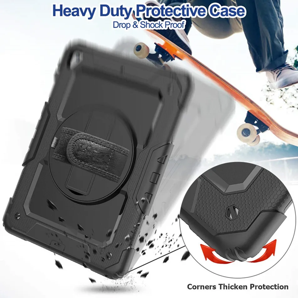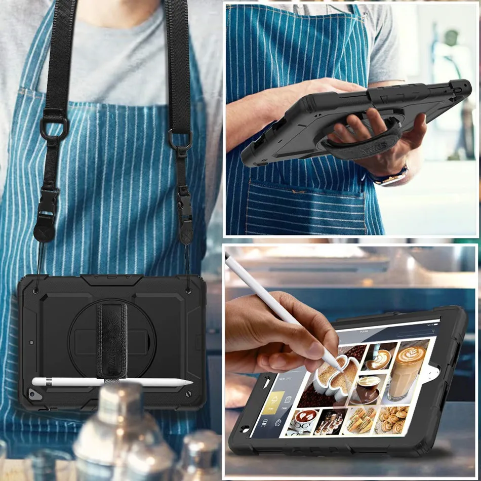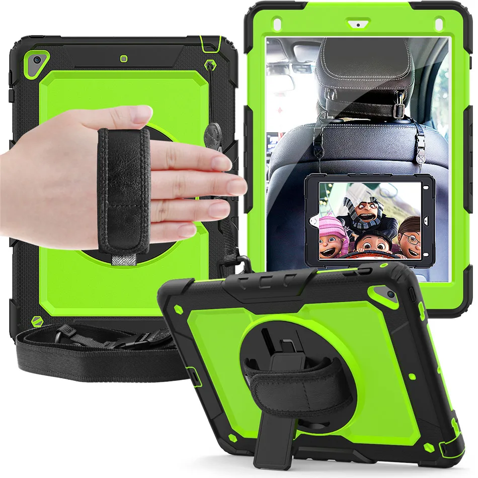 2. Мягкий ручной ремень и портативный плечевой ремень и вращающаяся подставка: обеспечивает безопасную защиту и больше удобства, когда вы играете или работаете с iPad. Повесьте его в любом месте для вашего лучшего развлечения, Освободите руки. Вращающаяся на 360 градусов подставка обеспечивает широкий угол обзора, с мягкой ручкой на ремешке, легче использовать ваш iPad для путешествий на открытом воздухе, работы, игр с детьми.