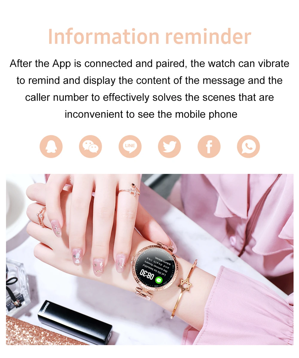 Push-сообщение: когда звонок или сообщение приближается, часы будут напоминать вам вибрацией, никогда не пропустите ни одного важного звонка или сообщения. Нажмите мгновенную информацию, такую как Facebook, Wechat, WhatsApp, вы можете получить sms-сообщение или уведомления приложения прямо на часах.