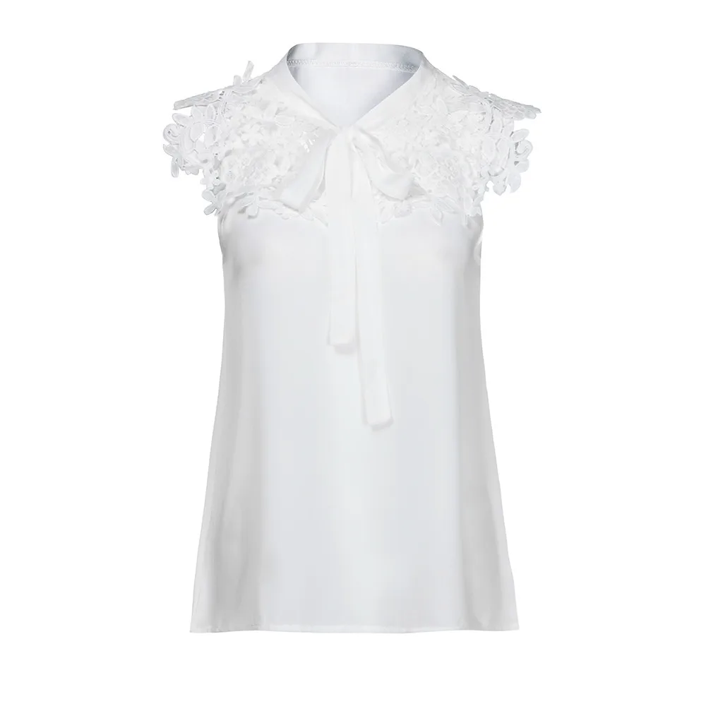 Эта модная блузка с кружевным вырезом, с галстуком, без рукавов и однотонным стилем. Легкая и неэластичная ткань. Свободный силуэт.