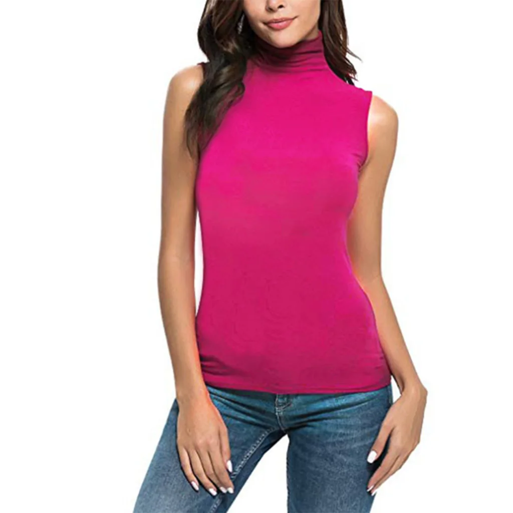 Без рукавов, ложная водолазка, высокая горловина, однотонный, базовый слой топа на бретелях, повседневный стиль пуловера, приталенный крой, 5 цветов на выбор.