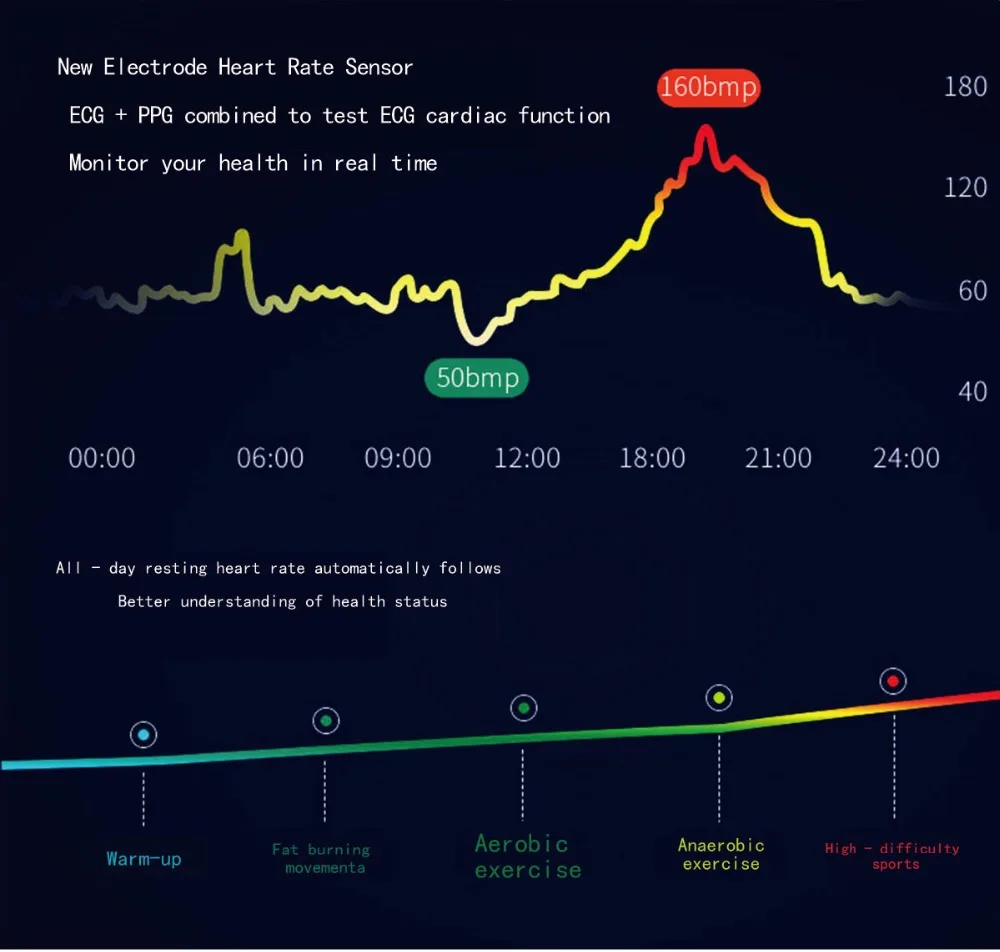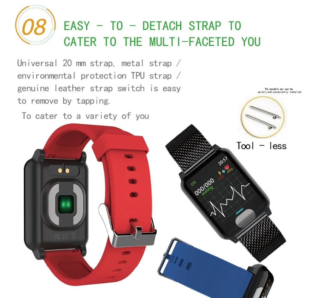 1. Совершенно новый электрод электрокардиограмма здоровый браслет (ECG + PPG). 2. В приложении вы можете добавить друзей в свою семью, чтобы следить за здоровьем ваших родителей в любое время и в любом месте. 3. Браслет содержит восемь режимов упражнений на выбор. Во время физических упражнений, частота сердечных сокращений и потребление калорий можно контролировать с минуты на минуту, а наиболее подходящие аэробные упражнения можно использовать для укрепления организма. 4. Когда измерение показателей ЭКГ завершено, отчет о состоянии здоровья автоматически генерируется и генерируется ЭКГ. Измеренные данные могут храниться в большом количестве облаков для легкого доступа и просмотра в любое время. 5. Полный сенсорный экран, простой в эксплуатации, отзывчивый, цветной дисплей четко и четко виден на солнце. 6. IP67 водонепроницаемый и пыленепроницаемый, не боясь ветра и дождя. Спецификация: Модель: E04 Импортный чип Bluetooth: Nrf52832 Уровень водонепроницаемости: IP67 Экран Размер: 1,3 дюйма цвет Экран Bluetooth: 4.0BLE (низкая мощность) Вход напряжение: DC 5,0 V Материал браслета: экологичный ТПУ Емкость аккумулятора: 200 мАч Время зарядки: около 4 ч Хранение данных: 3 месяца Совместимая система: Android 4,4 и выше, iOS 8,2 и выше. Размер: 245*33*11 мм/9,64*1,29*0,43'' Цвет: красный, черный, синий