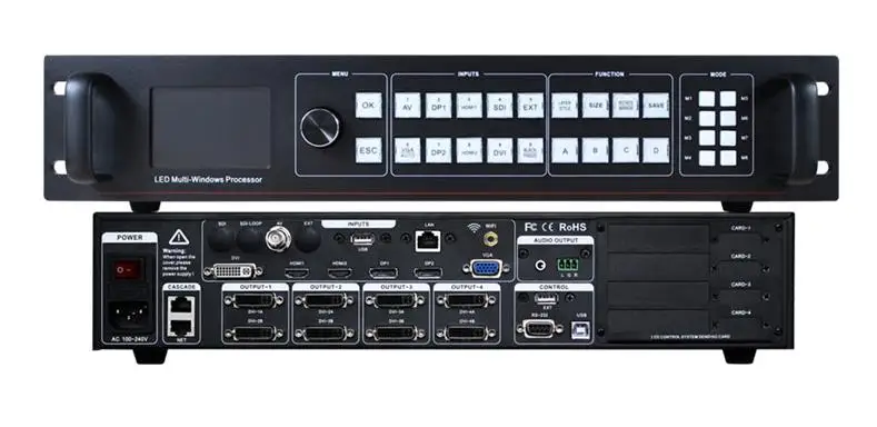 3840*2160 @ 60 Гц вход Одновременный ввод 4K * 2K 4 Windows произвольное масштабирование и роуминг • Самое большое разрешение сращивания 15360*640 @ 60 Гц, 4096*2304 @ 60 Гц, 3072*3072 @ 60 Гц, 960*8640 @ 60 Гц ► 10,5 миллионов пикселей можно настроить Разрешение ► По индивидуальному заказу Вход EDID Функция вращения изображения и зеркала ►Поддержка переключения времени и блокировки ► 10 режимов сохранены и 8 горячих вызовов Функция черного цвета и замораживания • Поддержка ввода SDI или USB (опционально) ● Синхронизация аудио декодирования выход Поддержка WIFI, управление RS232 Поддержка 8 стандартных карт отправки может установить 4 стандартных карты отправки