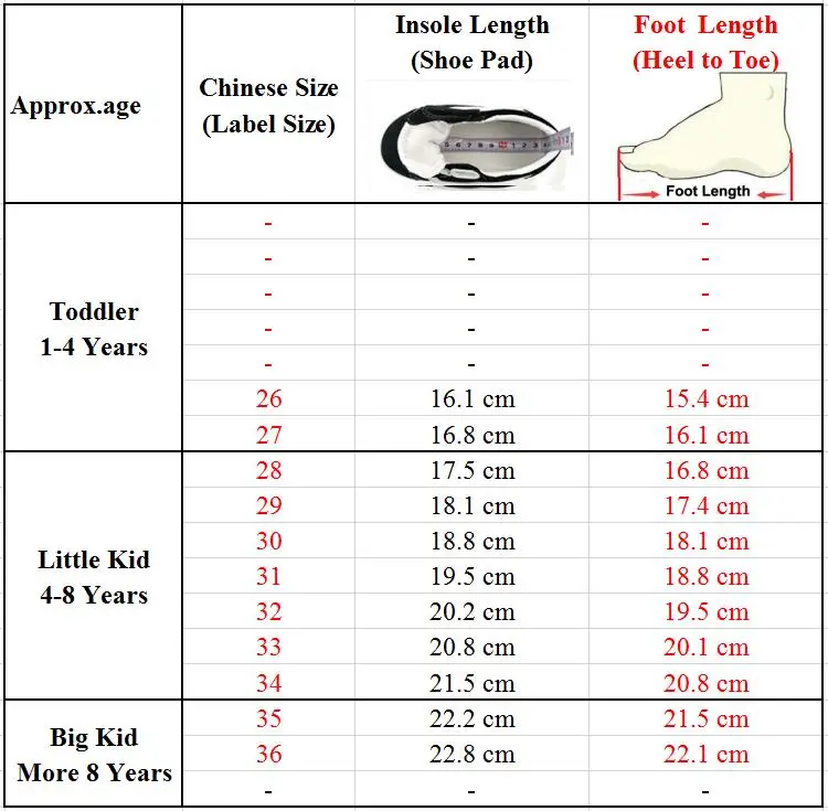 --(1) размер-китайский, а не европейский. -(2) Если у вашего ребенка полная или широкая стопа, пожалуйста, выберите больший размер. --(3) Если вы не знаете, как выбрать, пожалуйста, Измерьте длину стопы и сообщите нам.