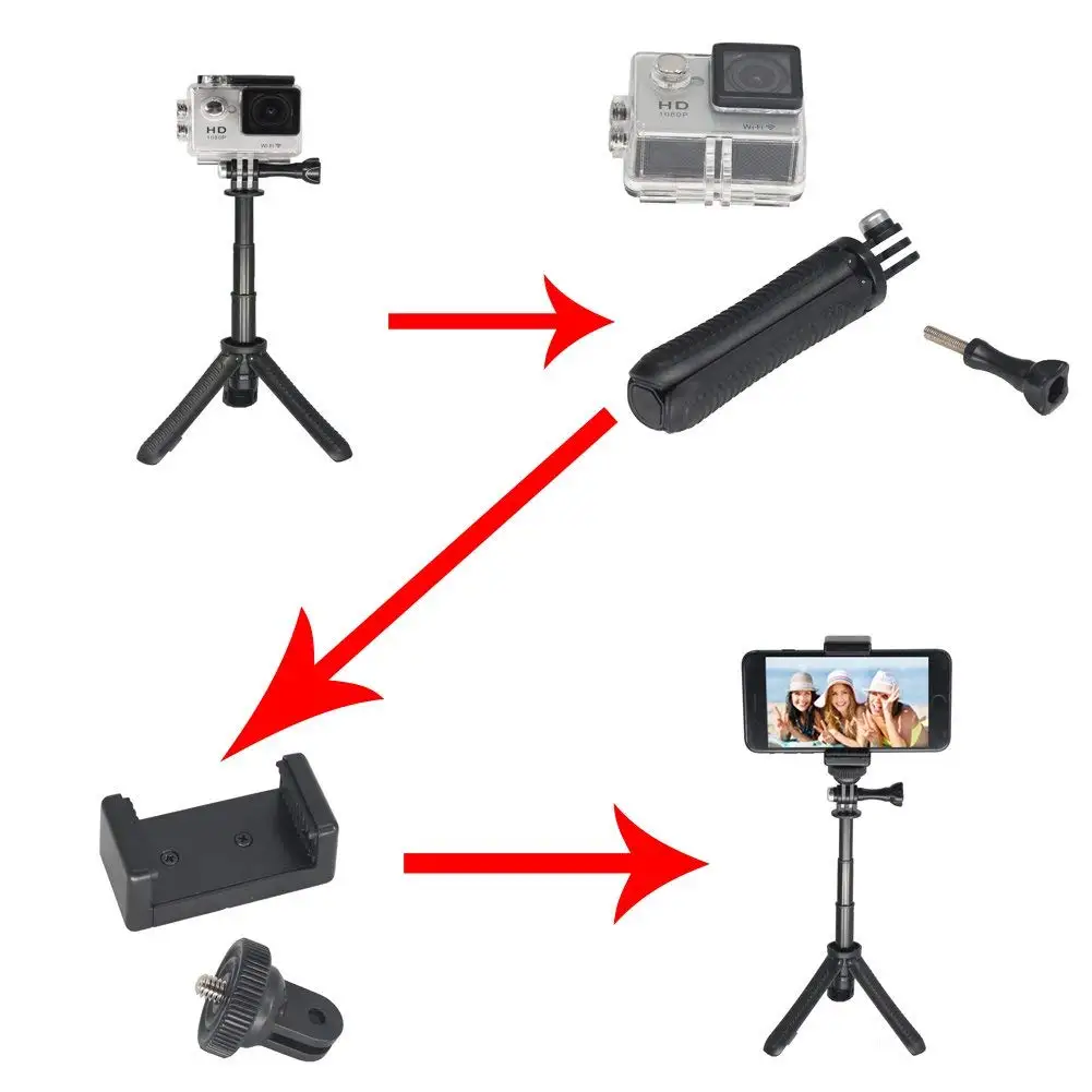 В дополнение к возможности подключения к камере gopro, вы также можете добавить Зажим для телефона, чтобы использовать в качестве селфи-палки для телефона.