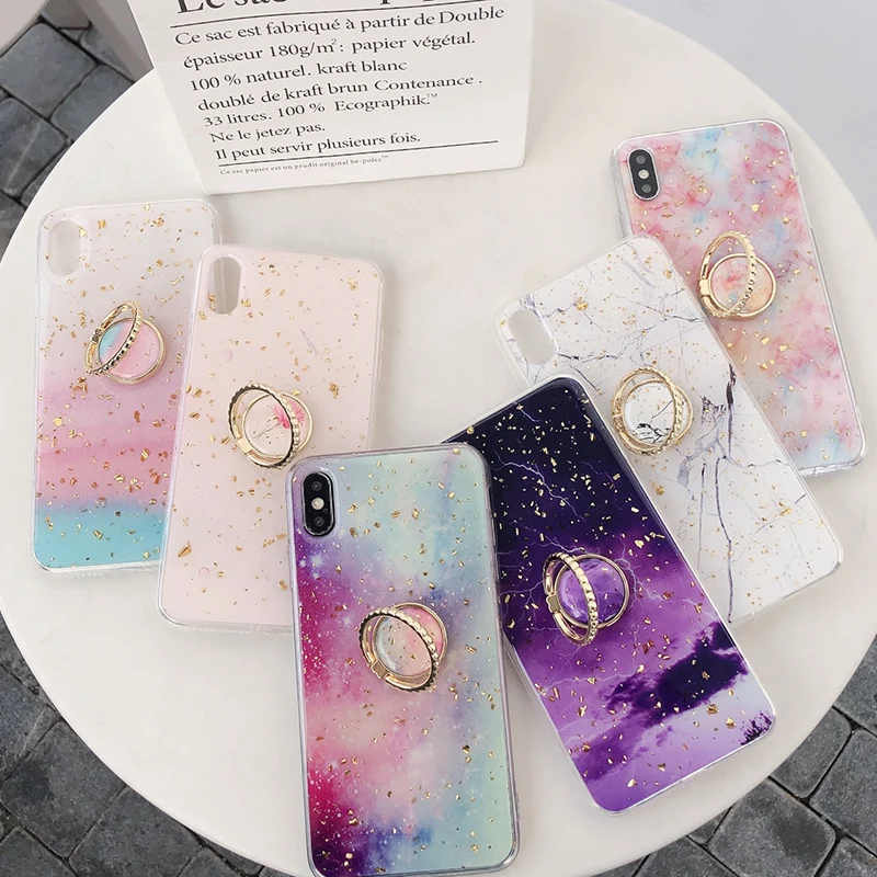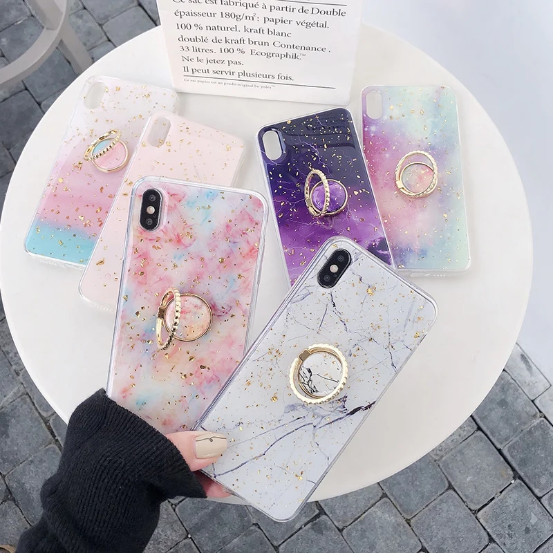 Золотой фольгированный блестящий Мраморный чехол для телефона iPhone XR XS Max X с кольцом на палец и подставкой Чехол для телефона
