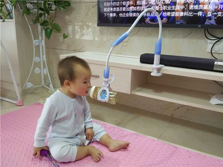 Name: Baby Feeding Bottle Holder Size: 95cm; 105 cm Color: Pink , Blue Material: Plastic Use: Bed; Baby Stroller Max Bearing Weight: 300g Feature: 360 Degree Rotating Max thickness for clipping: 8 cm Fit for bottle size: 10 cm Fit for Different kinds of bottle Attention: When using bottle holder for baby feeding, daddy or mummy should be watching. In case choking.