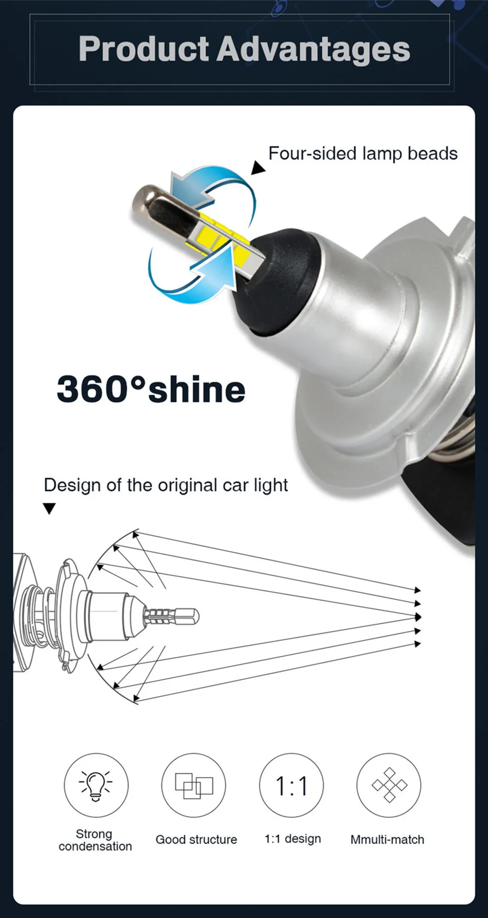 Тип штекера: 9006(HB4) : однолучевая 9005(HB3) : Одиночный луч 9012(Hir2) : однолучевая H11: одиночный пучок света H7: одиночный пучок света H1: одиночный пучок света D1S/D2S/D3S/D4S: однолучевая H4: дальний-ближний свет Особенности: Световой поток: 15000lm Рабочее напряжение: подходит DC12V, Цветовая температура: 5500K/6500K IP65 Номинальное водо-и пылезащитное уплотнение, угол луча 360 градусов Мощность: 52-60 Вт на пару (обычно реальная мощность будет 80-90%, это нормально) Материал: авиационный алюминиевый профиль 6063 Рабочая температура: -40-+ 80 градусов Цельсия Более 30000hrs жизни Использование: фара, противотуманная фара Двусторонний канал отвода тепла Адаптер: Наши лампы являются разъемами stardand, пожалуйста, купите дополнительные адаптеры в нашем магазине, если вашему автомобилю нужны дополнительные адаптеры. (Некоторые автомобили используют H7 extra или specail адаптеры) CANBUS: Ошибка бесплатно для 98% автомобилей. (Не подходит для специальных автомобилей, например: не для Volvo, не для сиденья, не для Scania, не для BMW-mini/e83/e90, не для Skoda Octavia A7, не для VW-golf, не для Hyundai santa, не для Opel серии и других специальных автомобилей), для большинства автомобилей, не нужно покупать внешний canbus.
