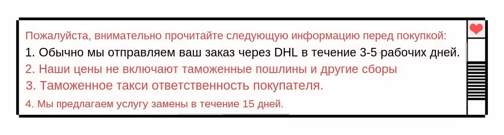 Доставка товара: мы организуем доставку в течение 2-3 дней после оплаты, и она будет доставлена в течение 3-7 дней по всему миру dhl, как правило( Покупатель несет ответственность за таможенный налог в вашей собственной стране )
