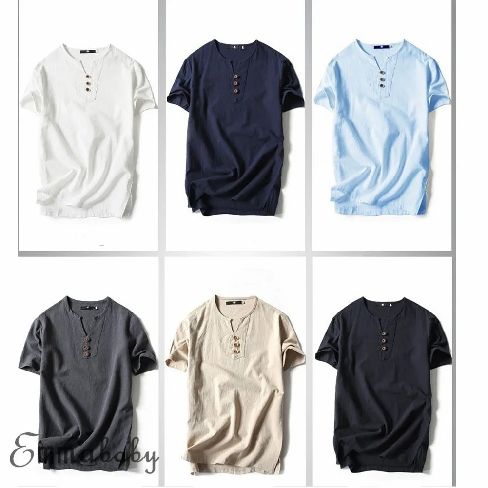 Летняя мужская льняная Повседневная футболка с v-образным вырезом и коротким рукавом, дышащая футболка