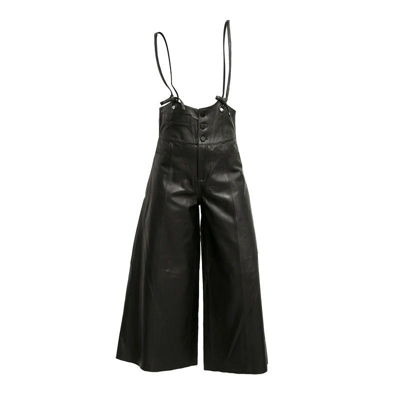 Уличная одежда, кожаный комбинезон для женщин, весна, повседневный ремень, овчина, натуральная кожа, широкие ноги, комбинезоны, однобортные женские штаны