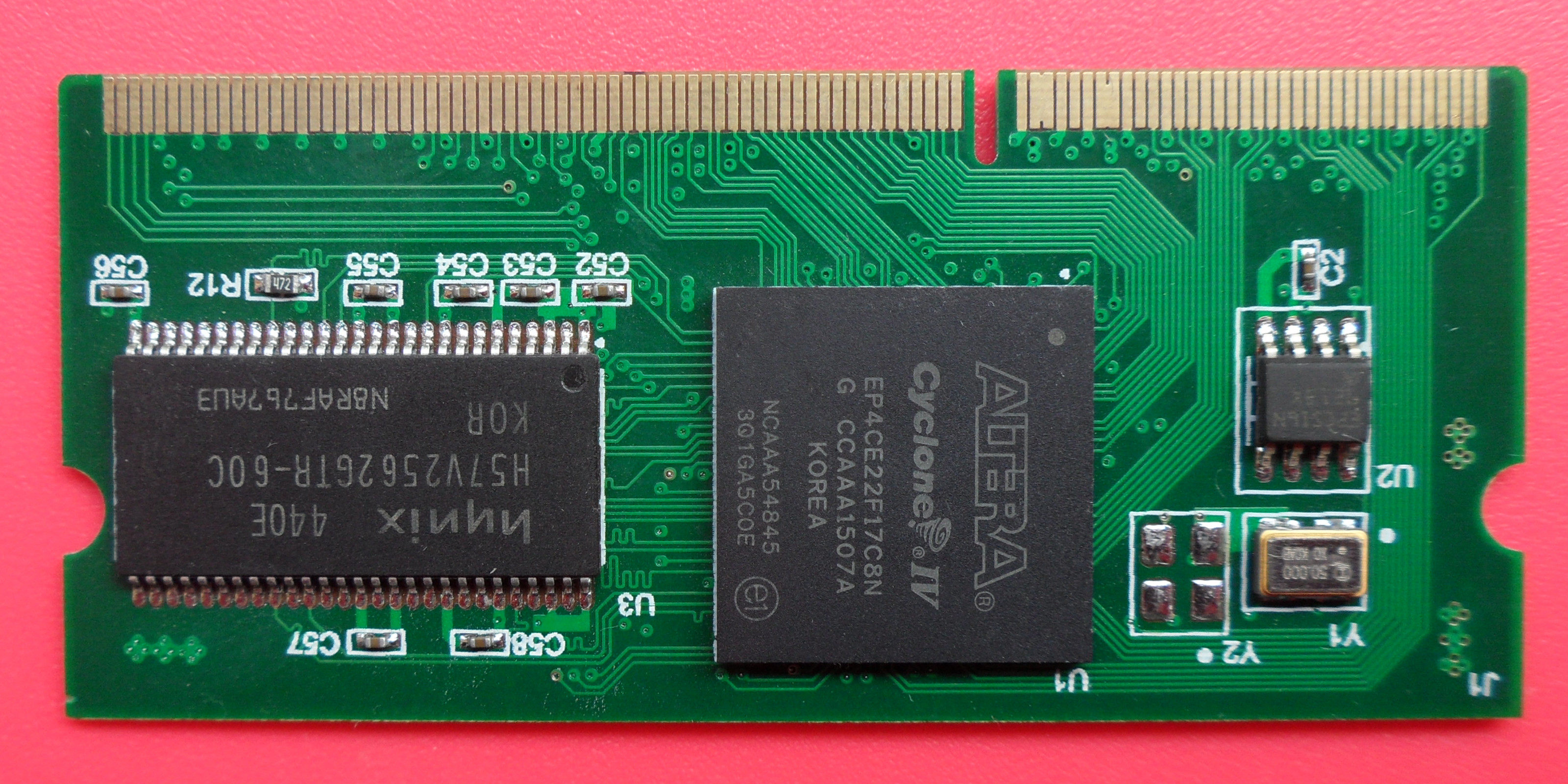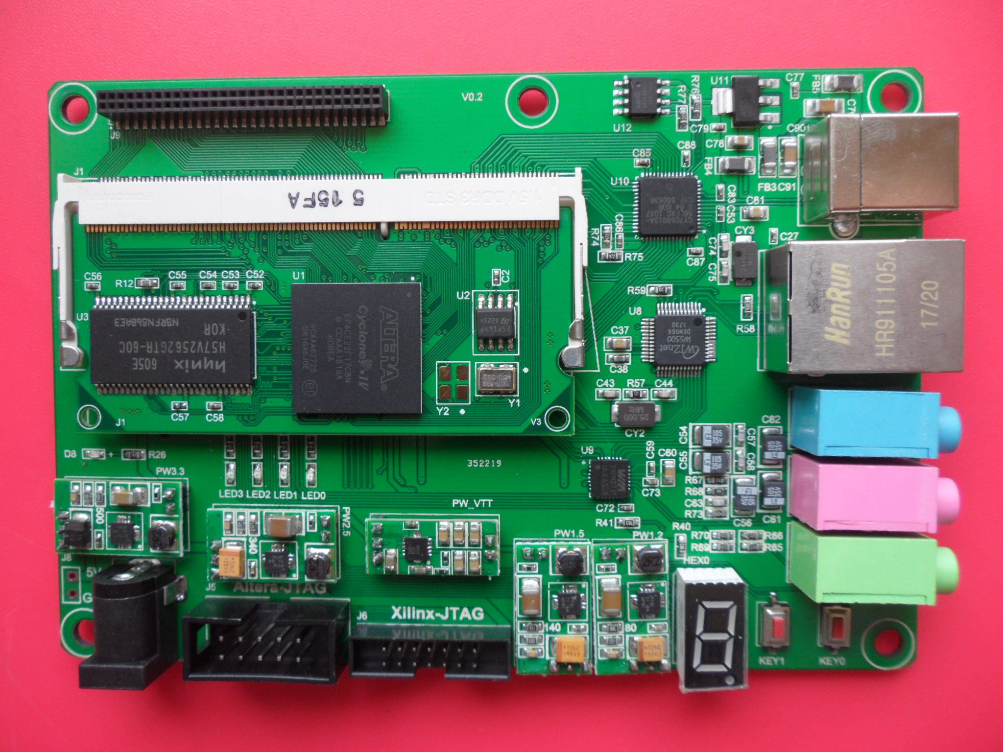 Основная плата ресурсы:1. ядро EP4CE22F17C8N, BGA упаковка, инчиповые ресурсы и IO многое другое.2. чип конфигурации EPCS16.3. Поддержка JTAG и в качестве режимов настройки.4. SDRAM с емкостью до 256 Мбит (32 Мб).5. один активный кварцевый генератор 50 МГц на доске, с расширяемой пластырь кристаллического осциллятора.6. остальные 90 IOs, потому что DDR3 на золотой палец для расширения.7. Он может поддерживать 4 пары дифференциальных часов вход и 8 пар дифференциальных часов вход в один конец.8. Золотая пальчиковая доска может быть использована независимо для пользователей для гибкого расширения.Расширена плата ресурсы:1. SO-DIMM-204PIN разъем, может быть приклеен с нашей различной FPGA золотой палец основной платы.2. TI модуль питания TPS62130, 3,3 В/2,5 в/1,5 В/1,2 В напряжение.3. TI модуль питания TPS51200, DDR эталонное напряжение, ингаляция тока и всасывание (раковина и источник).4. Поддержка Стандартный JTAG интерфейс загрузки Altera и Xilinx.5. USB 2,0 чип CY7C68013A поддерживает 480 Мбит/с высокоскоростной режим и GPIF интерфейсом.6. Чип Ethernet W5500 поддерживает 100 Мбит/с, протокол TCP/IP/UDP и интерфейс SPI.7. аудио чип WM8731, 24bit ADC/DAC, 96 Кбит/с, интерфейс IIS.8. Пользовательский IO Расширенный разъем 2*30 PIN.9. один SD разъём, один цифровой светодиодной лампой, две клавиши и четыре светодиодный свет.
