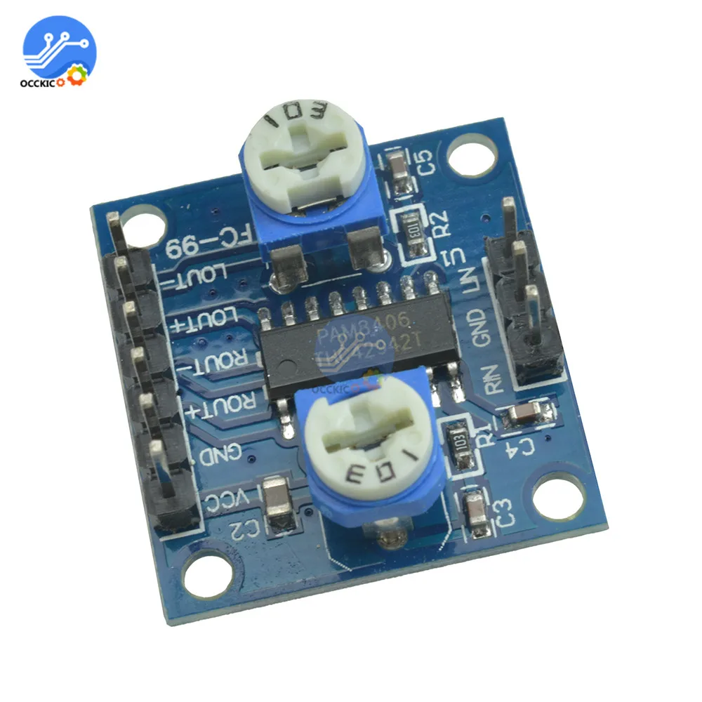 3. Двухканальный стерео, 5 в источник питания может выводить мощность 5 Вт + 5 Вт, непосредственно управлять 4 Ом, 8 Ом динамиками, выходная мощность, полная энергия, хорошее качество звука, С регулировкой громкости левого и правого канала.