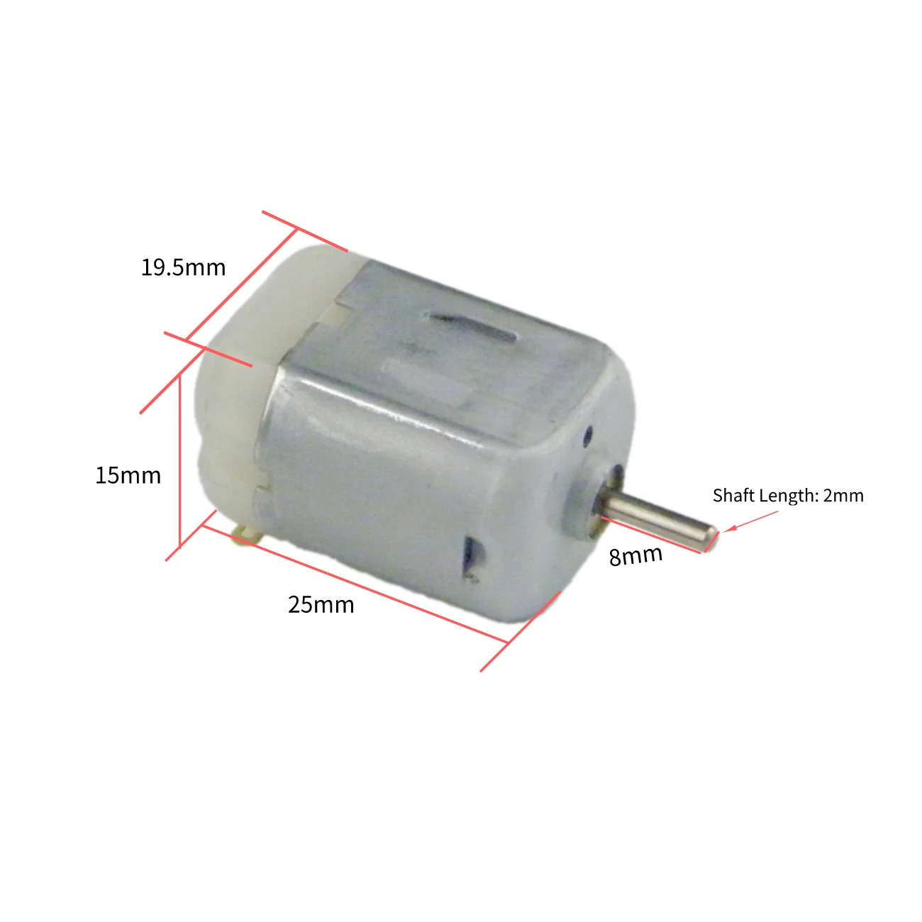 Диаметр вала: 2,0 мм; Длина вала: 8 мм; Скорость: (3 В постоянного тока, 0,12а, без нагрузки): 8600р/мин; (6 В постоянного тока, 0.15A, без нагрузки): 17500р/мин; (7,2 В постоянного тока, 0,16 А, без нагрузки): 21000 об/мин; Размер: 20 мм * 15 мм * 19,5 мм;