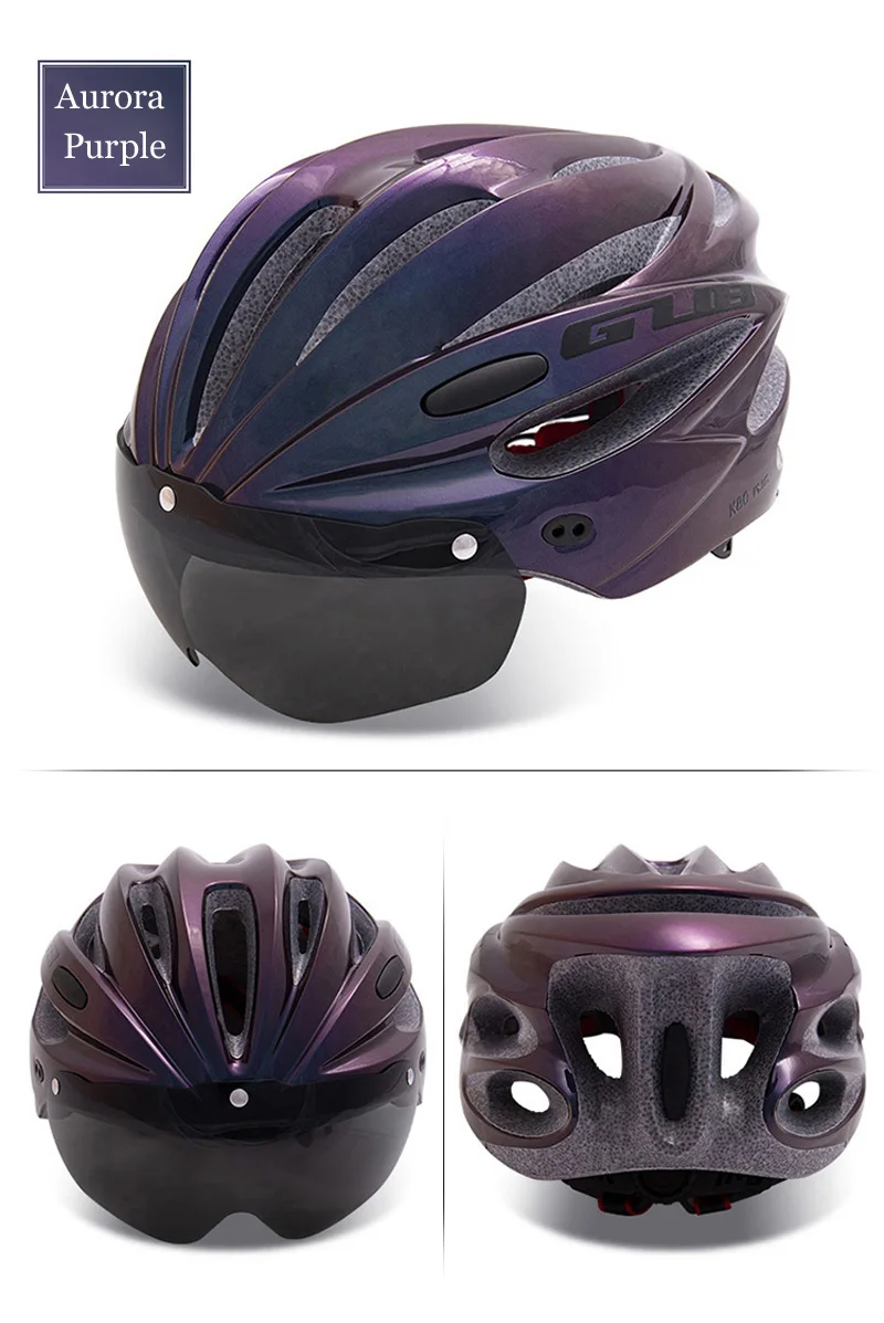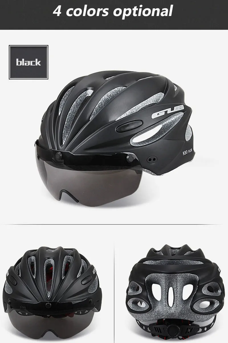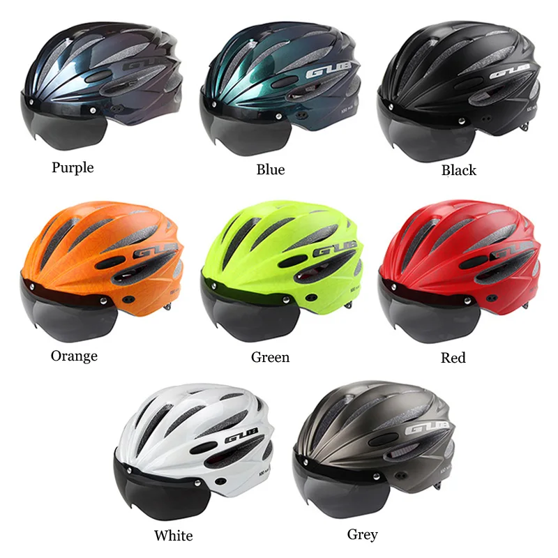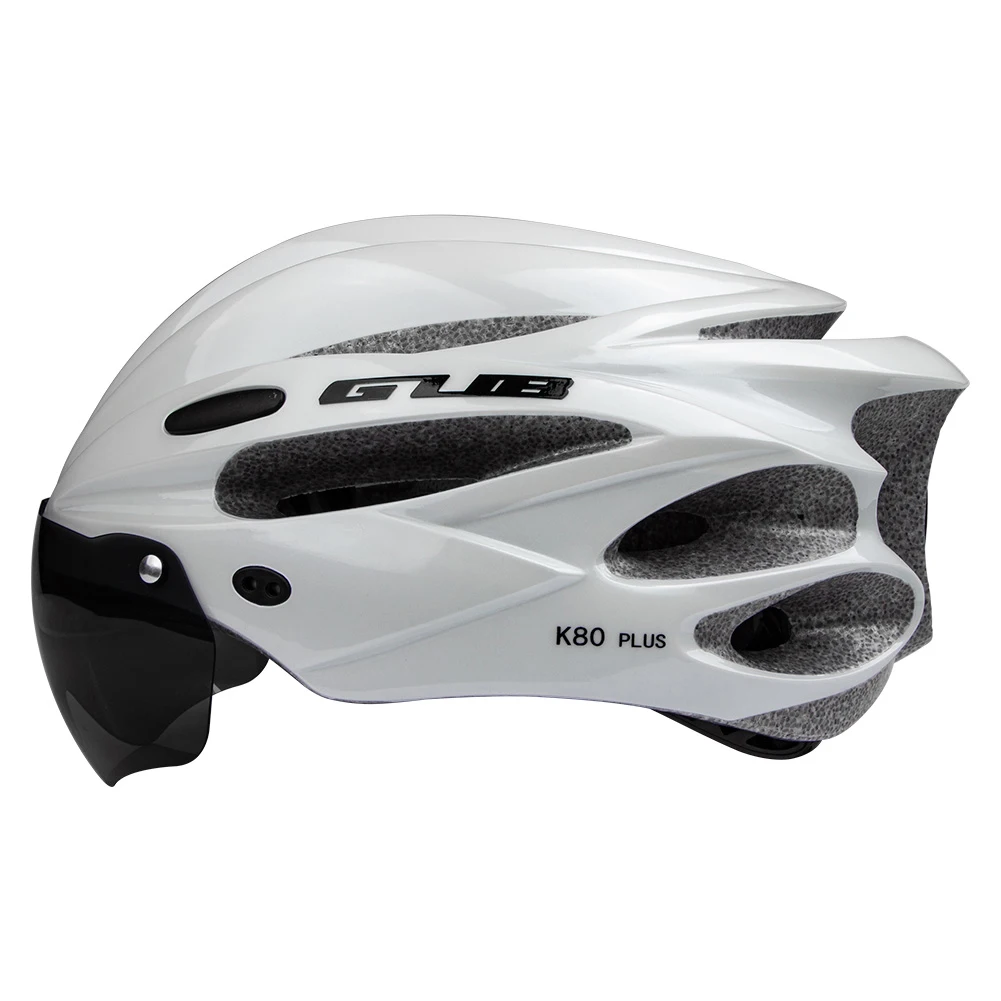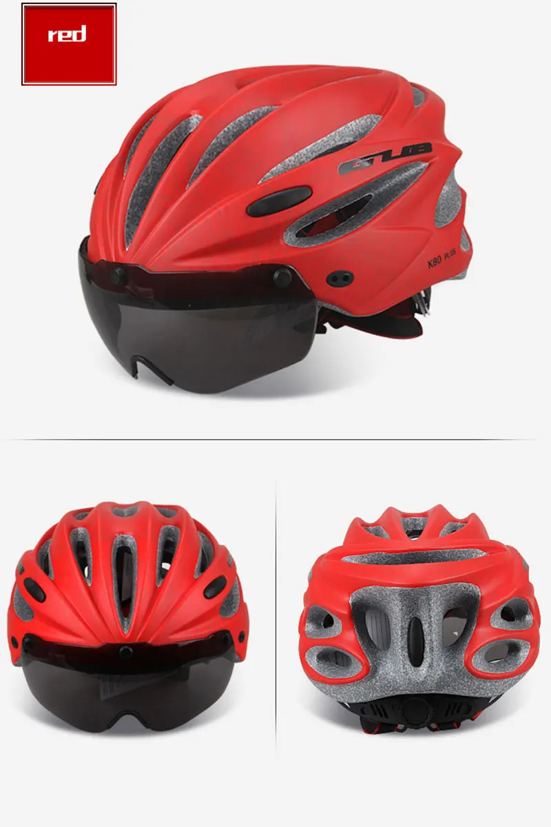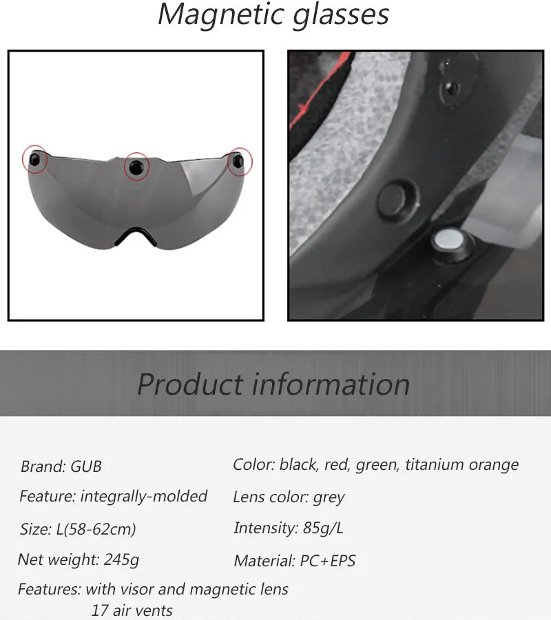 Продукт: 1. Название: шлем GUB K80 Plus 2. Материал: корпус головного убора (PC) (EPS) 3, окружность головы: код L (58-62 см) 4. Количество отверстий: 17 отверстий 5, плотность: 85 г/л 6, вес: 245 грамм (вес нетто) 7. Цвет: красный, черный, оранжевый, зеленый, серый, белый. Аврора фиолетовый, Аврора зеленый 8. Особенности: бесплатная установка очки с магнитами, Очки и поля двойного назначения, отличный дизайн, Тонкое мастерство, экономичный выбор Посылка включает: 1 x велосипедный шлем 1 х серые линзы 1 x козырек