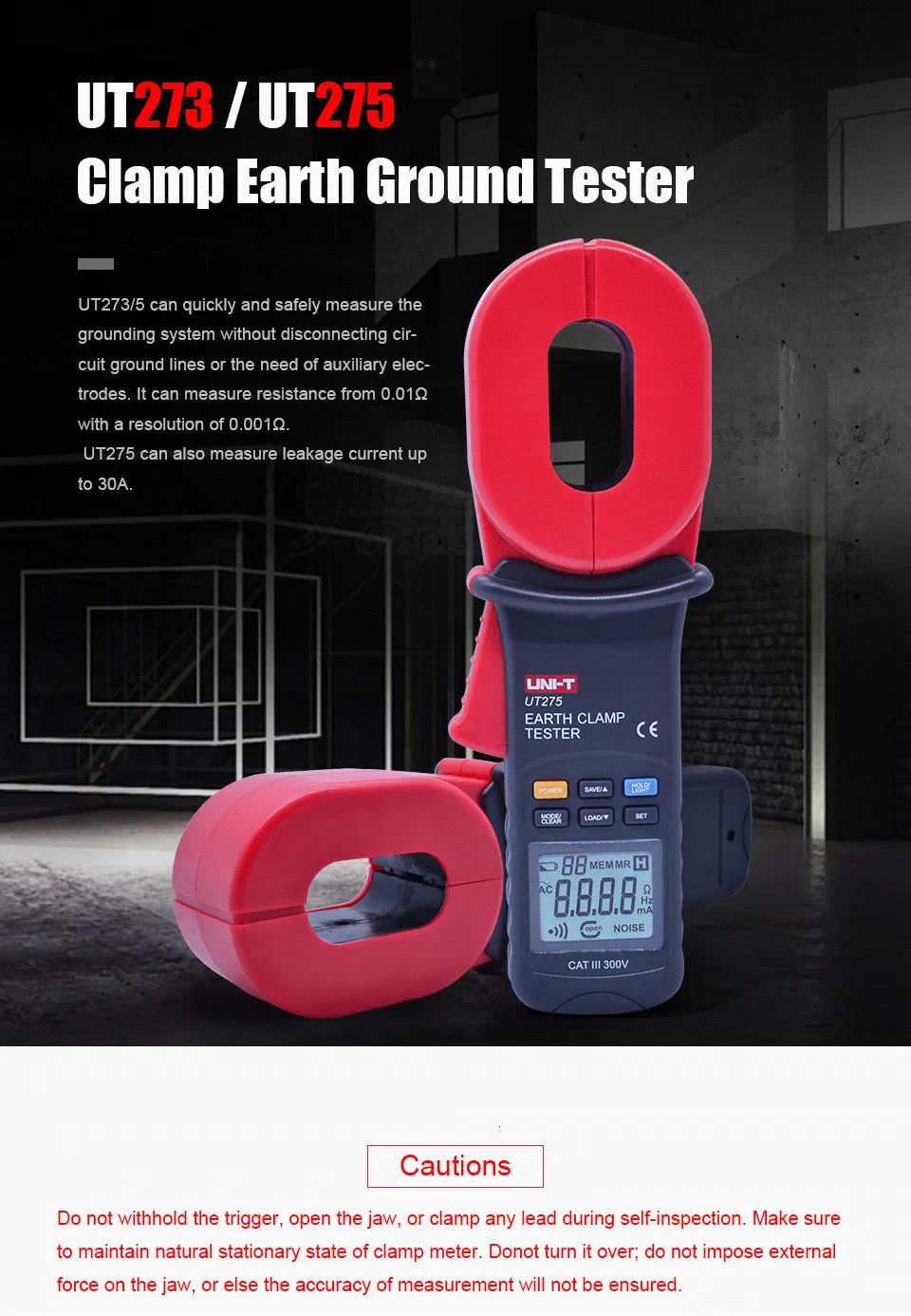 Серия UT270 может быстро и безопасно измерять систему заземления без отключения линий заземления или необходимости дополнительных электродов. Он может измерять сопротивление от 0,01 Ω с разрешением 0,001 Ω. UT275 также может измерять ток утечки до 30A. Эти clamps'double insulation design делают их прочными инструментами для наружной работы и эффективно блокируют помехи от окружающей среды.
